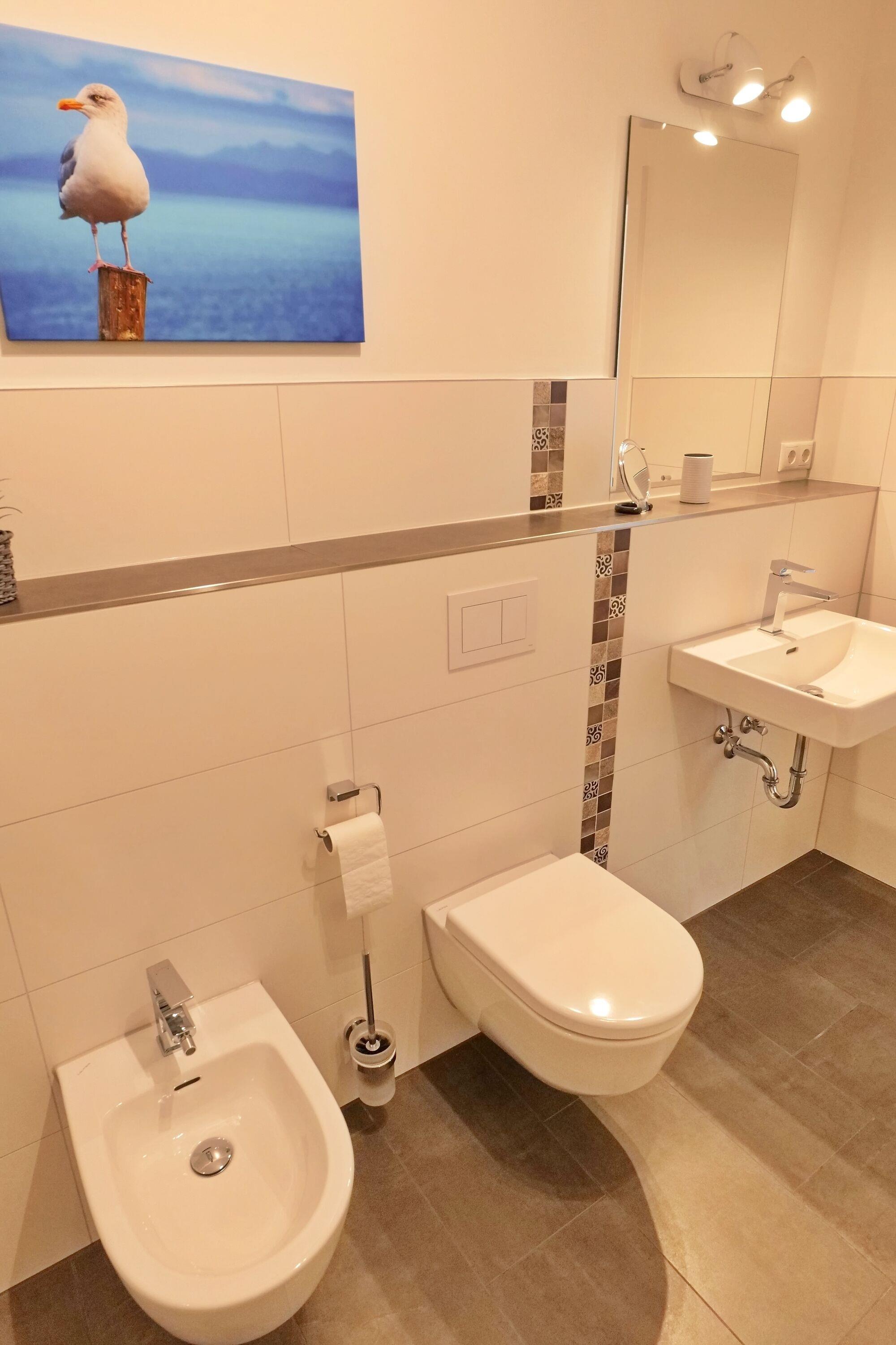 Im Appartement befindet sich ein Duschbad mit Waschtisch, WC, Bidet und Handtuchheizung.