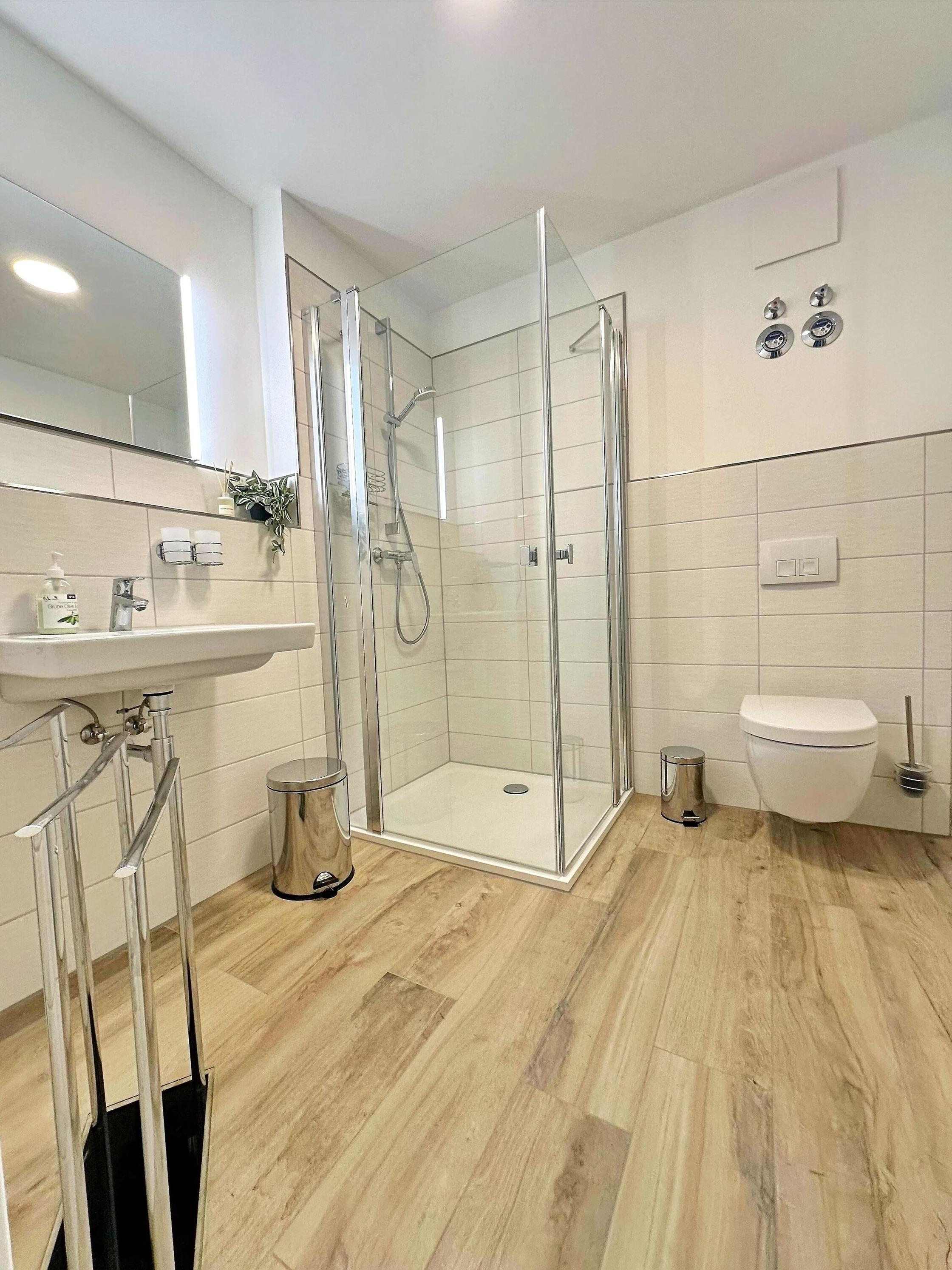 Das ebenerdige Badezimmer mit Dusche, Waschtisch, Spiegel und WC ist modern gestaltet. Hier verbringt man gerne etwas länger Zeit, um sich für den anbrechenden Tag vorzubereiten.