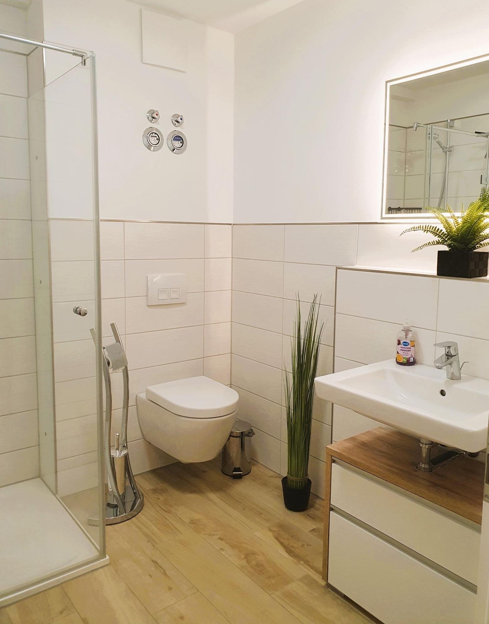 Das innenliegende Duschbad mit Fußbodenheizung und ebenerdiger Dusche bietet den idealen Start in den Urlaubstag.