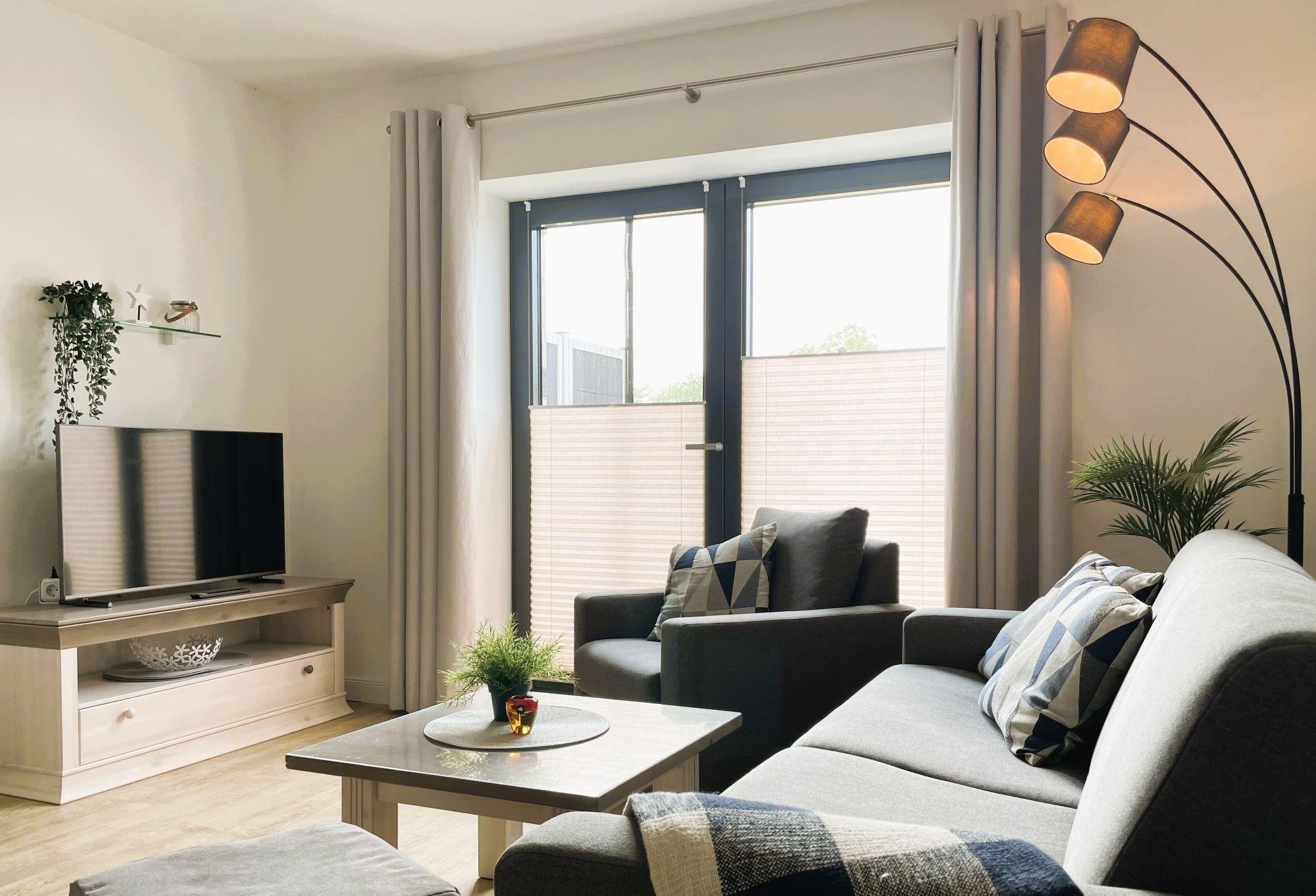 Die Wohnung verfügt über ein Schlafzimmer/ Schlafkoje mit einem Doppelbett, Kleiderschrank und einem TV. Das angrenzende Wohn- und Esszimmer bietet auf Grund der guten Aufteilung die Möglichkeit, Kochen, Wohnen und Home-Office zu integrieren.