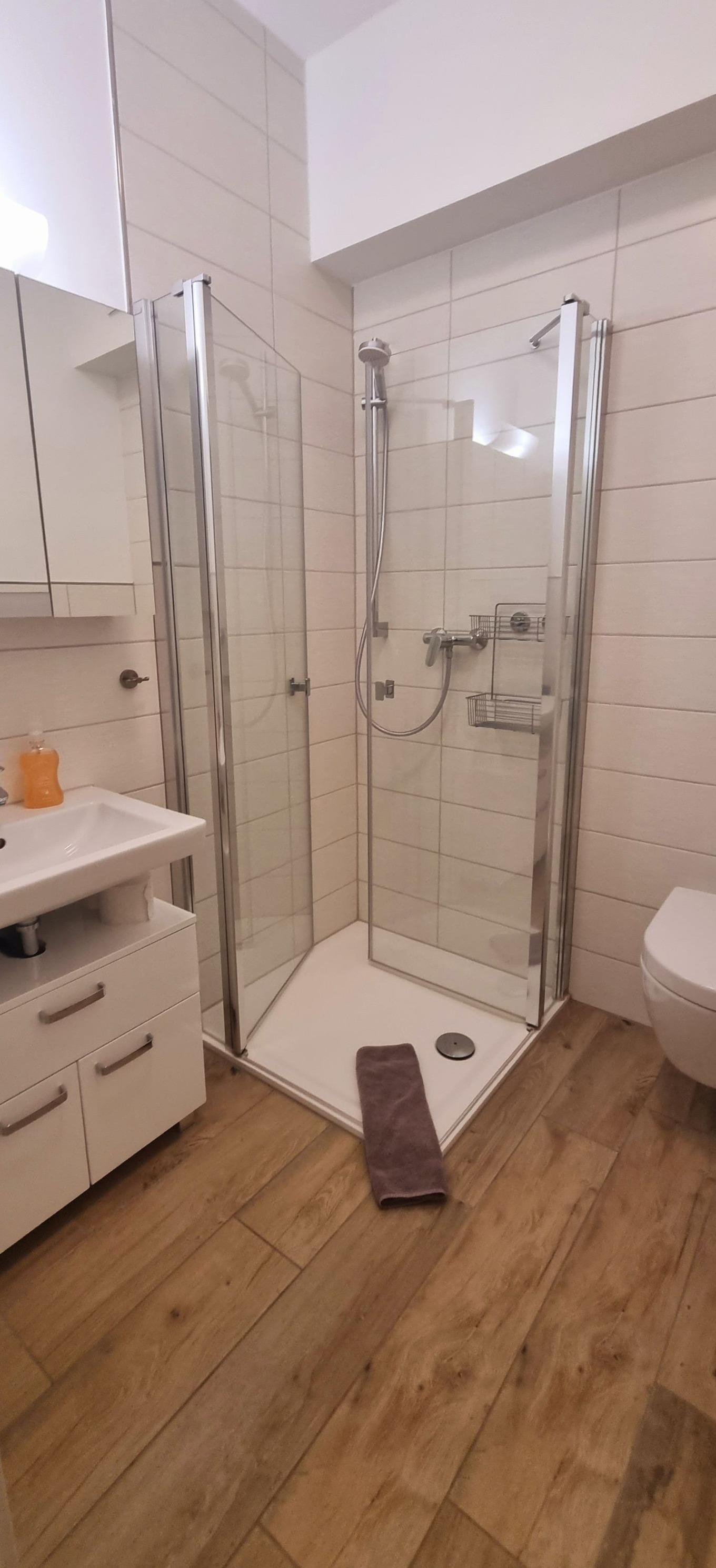 Die modern ausgestattete Küchenzeile und der Esstisch runden diesen Bereich ab. Klein aber fein ist das moderne Duschbad mit bodengleicher Dusche.