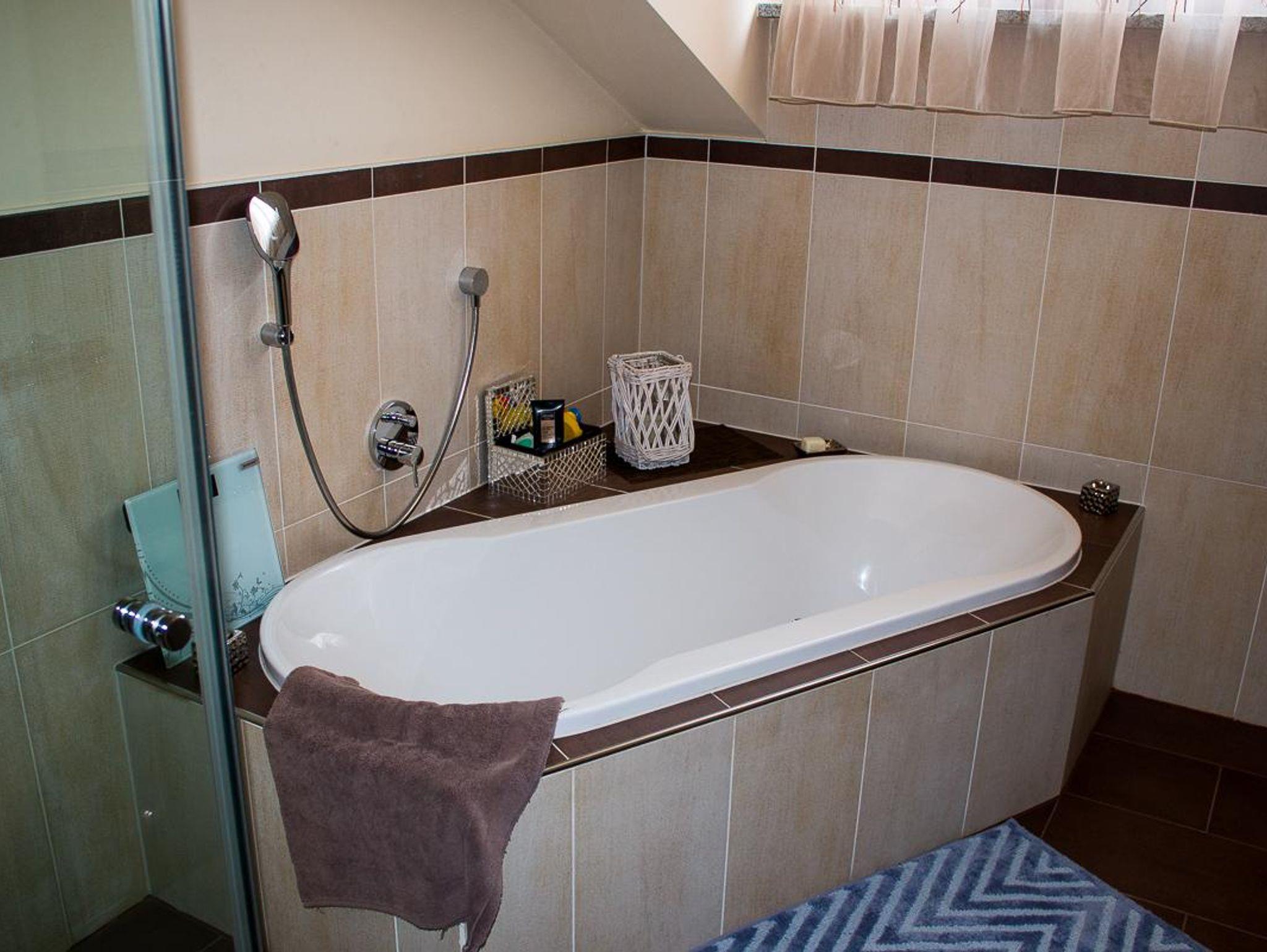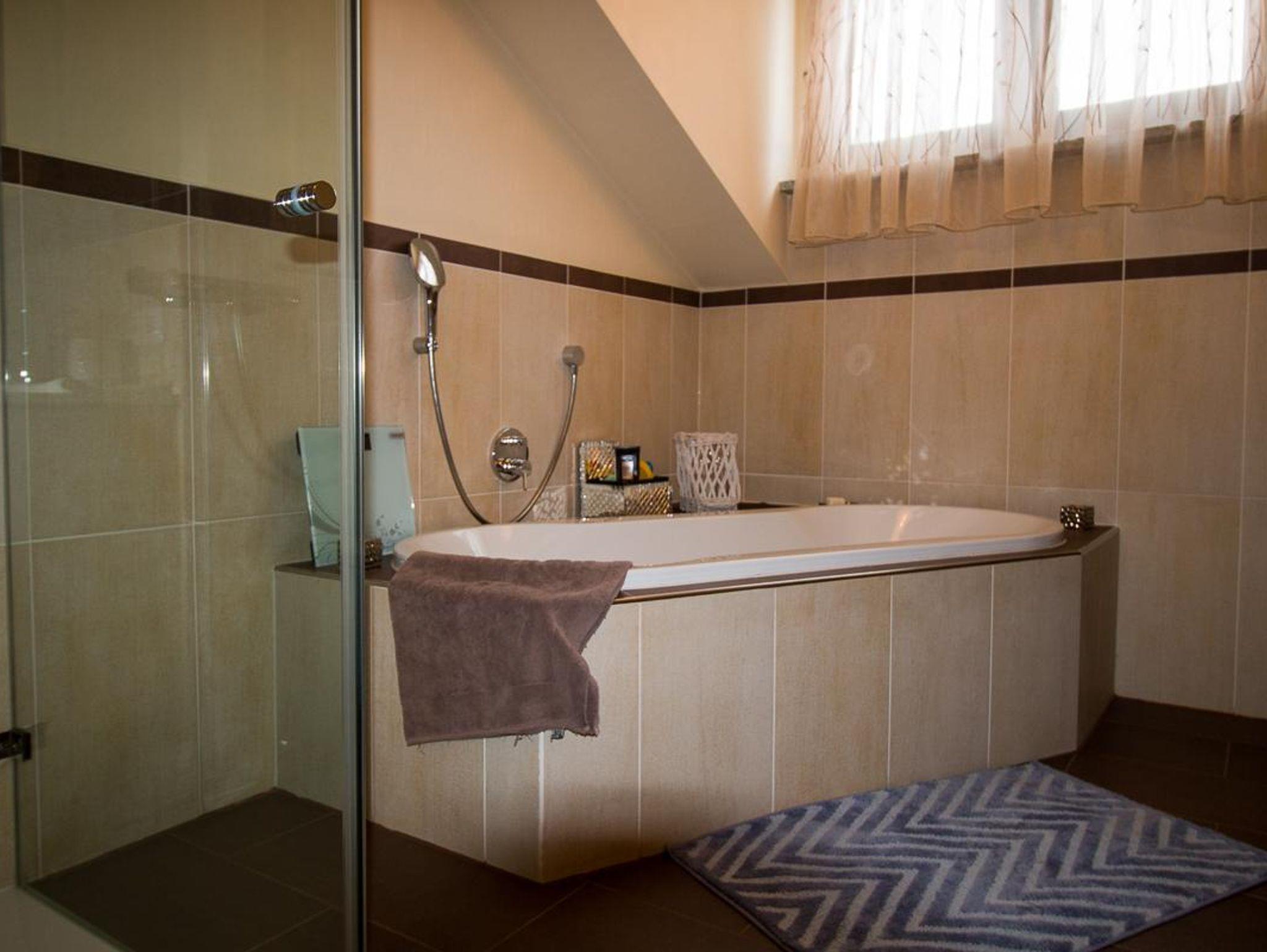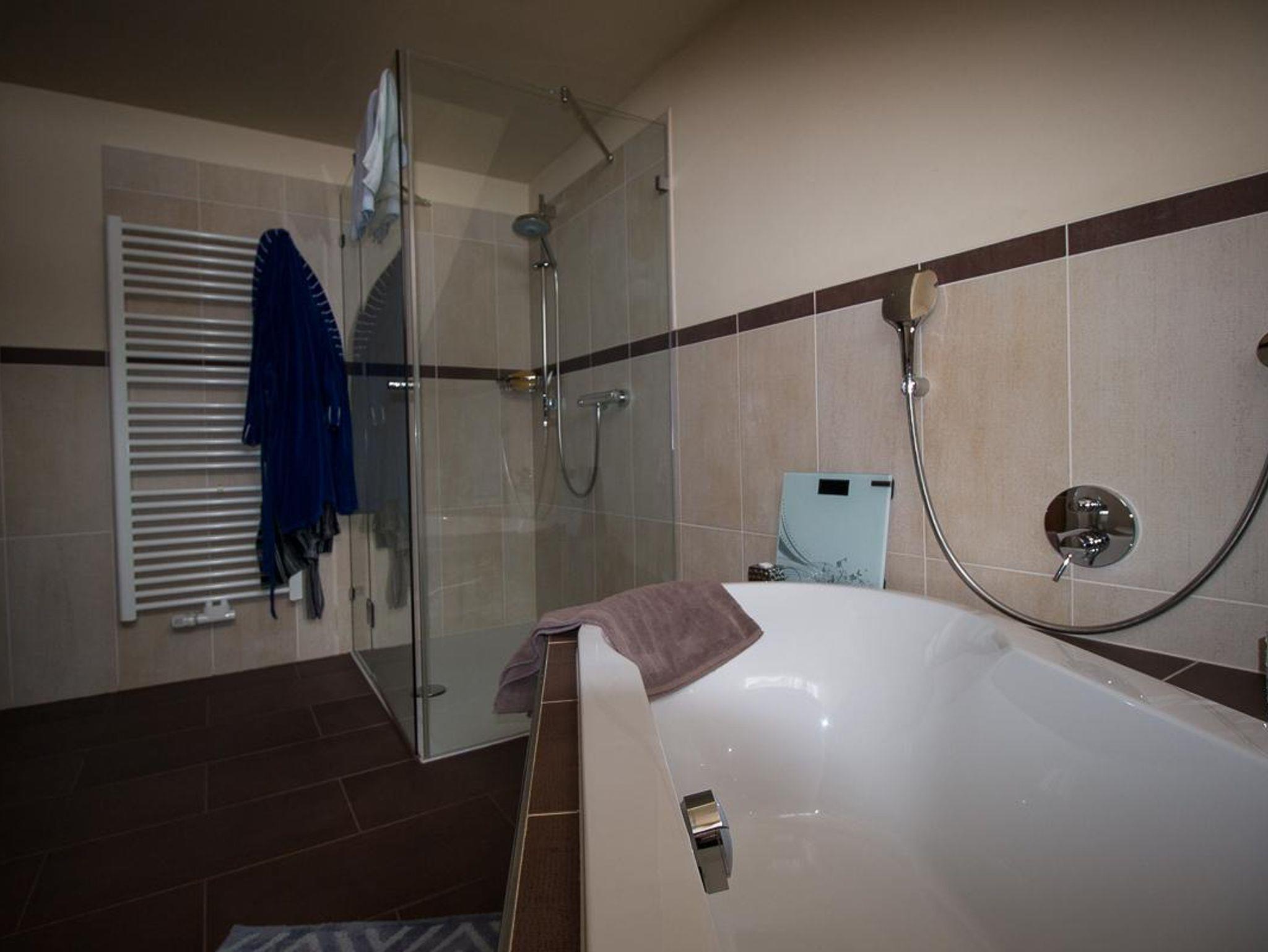 Handtuchwärmer und Badewanne. Ebenfalls im Raum sind Trockner sowie