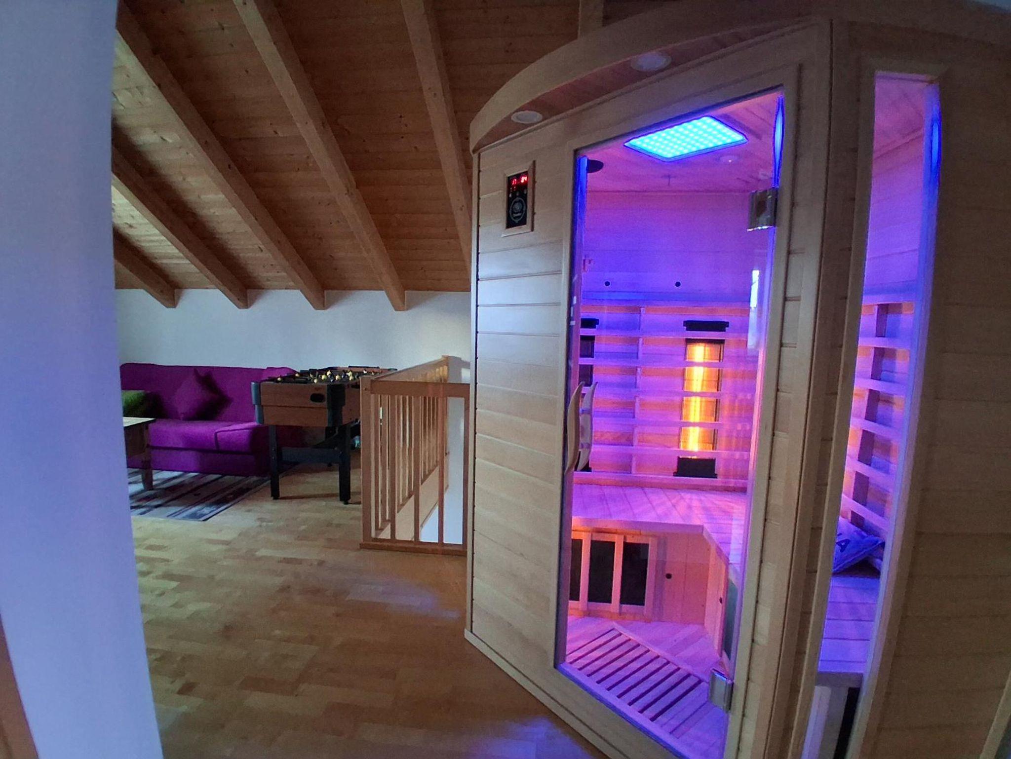 Das Ferienhaus bietet auf 105 Quadratmetern Platz für bis zu 4 Personen. Im Erdgeschoss befinden sich Koch-, Ess- und Wohnbereich sowie ein separates WC. Im Dachgeschoss befindet sich ein separates Schlafzimmer, eine Galerie sowie das Badezimmer. Das Ferienhaus verfügt über einen offenen Wohn- und Essbereich mit gemütlicher Sitzecke, TV und Kamin. Von hier aus haben Sie zudem Zugang auf die Holzterrasse und zum Garten. Die Küche ist mit Kühlschrank, Backofen, Herd, Spülmaschine, Toaster, Wasserkocher und Kaffeemaschine voll ausgestattet. Im Dachgeschoss erwartet Sie eine schöne, großzügige Galerie mit Bibliothek, Infrarotsauna, Kicker-/Billardtisch sowie ein Schlafsofa. Das separate Schlafzimmer verfügt über ein Doppelbett und ein Einzelbett sowie Zugang zum Balkon. Das Tageslichtbad verfügt über Dusche, Badewanne, Waschbecken und WC. Bettwäsche und Handtücher sowie WLAN stehen Ihnen kostenfrei zur Verfügung.