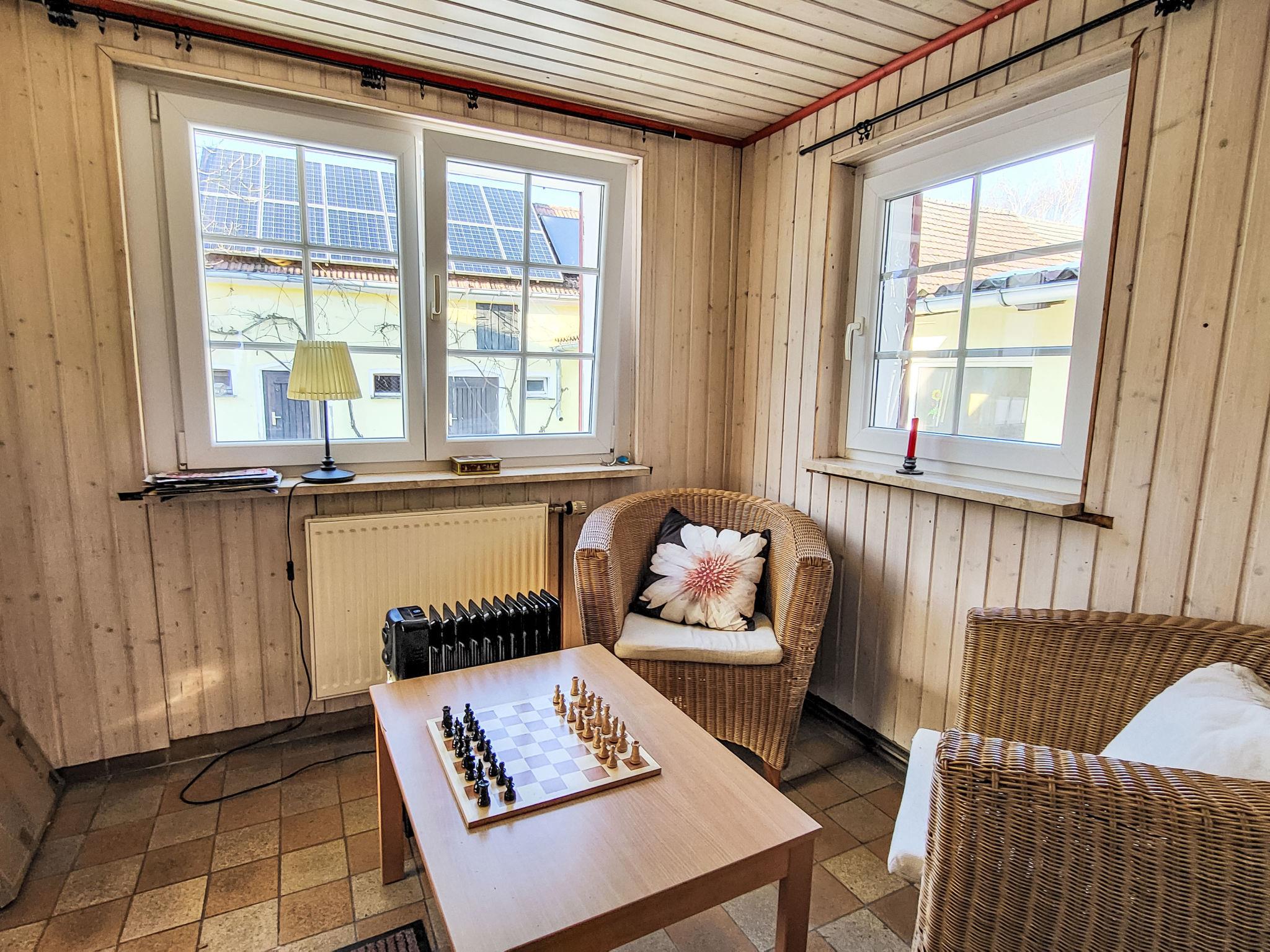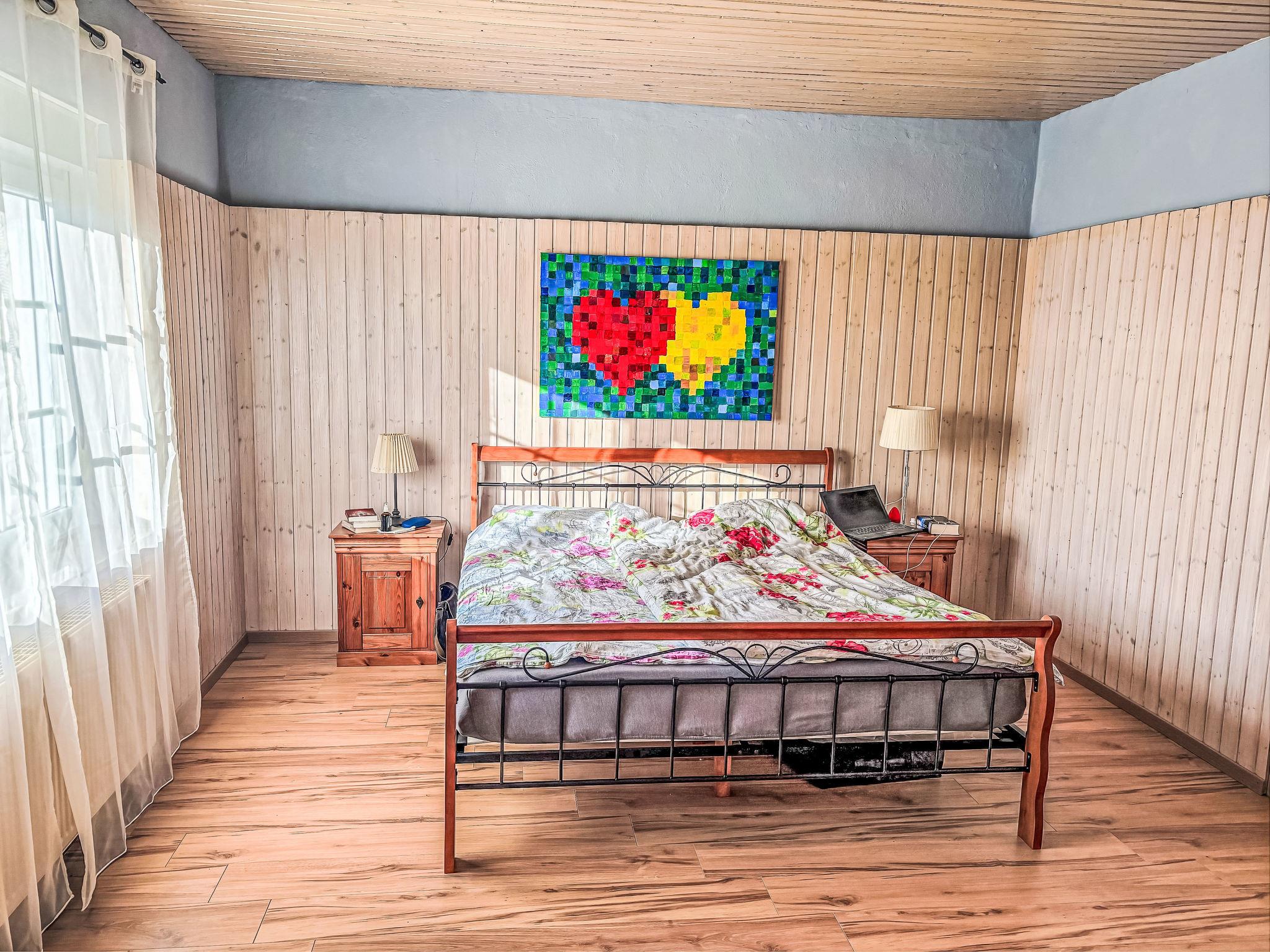 "Mit großem Garten", 3-room house 100 m2 on 2 levels. Rustic and wooden furniture furnishings: living/dining room with dining table and satellite TV (flat screen). 1 room with 1 double bed (180 cm, length 200 cm). Large kitchen (oven, dishwasher, 4 ceramic glass hob hotplates, toaster, kettle, electric coffee machine, Capsules for coffee machine (Nespresso) extra). Bath/shower/WC. Upper floor: 1 room with 1 double bed (160 cm, length 200 cm). Electric heating. Wooden floors, natural stone floors. Terrace, patio. Terrace furniture, barbecue. Facilities: washing machine. Internet (WiFi, free). Parking (2 cars). Please note: non-smoking house. Maximum 3 pets/ dogs allowed. Smoke alarm, fire extinguisher.