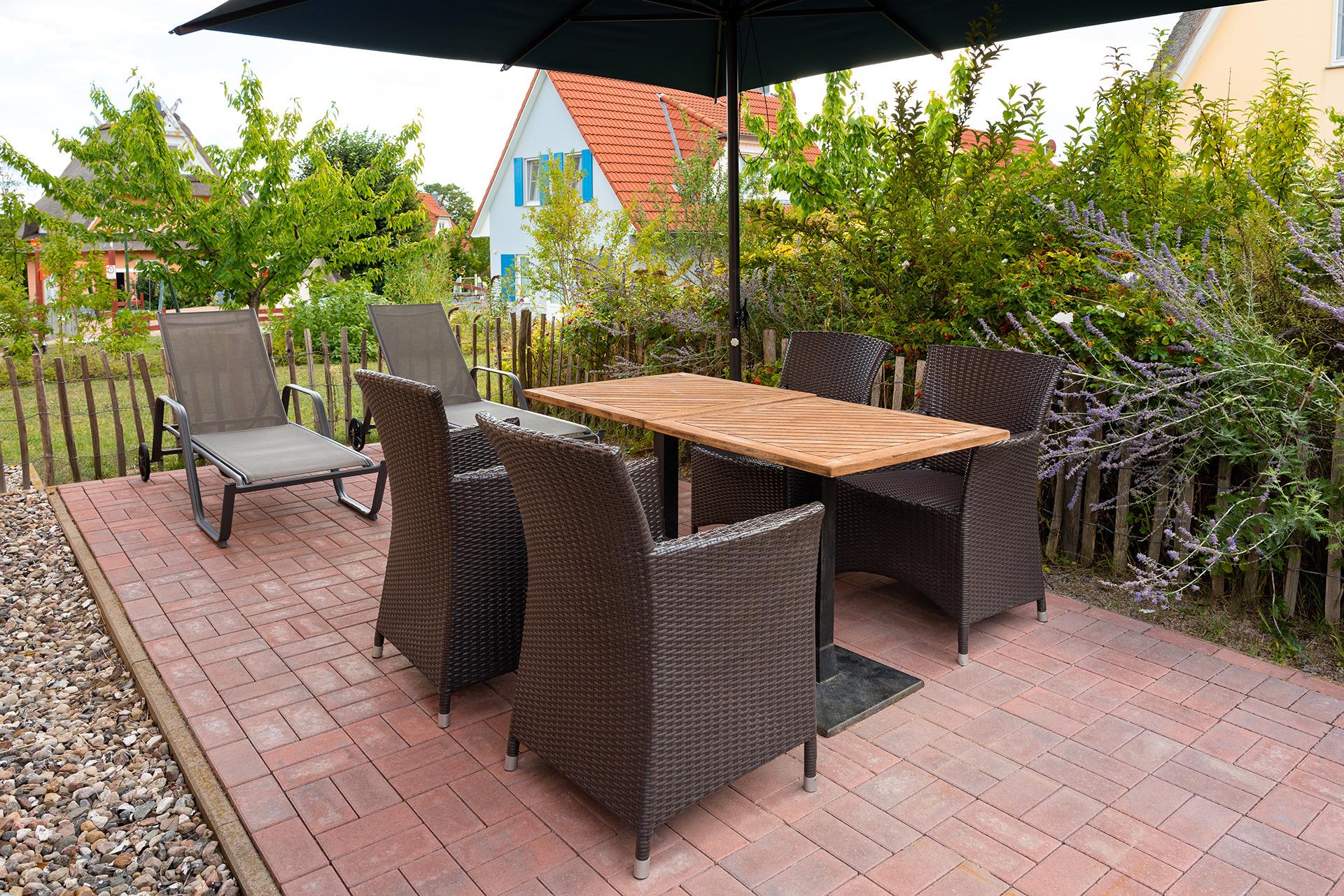 Auf der möblierten Terrasse können Sie den Tag bei einem Grillabend ausklingen lassen. Für Ihre Ausflüge ans Meer steht ein Bollerwagen optional zur Verfügung.