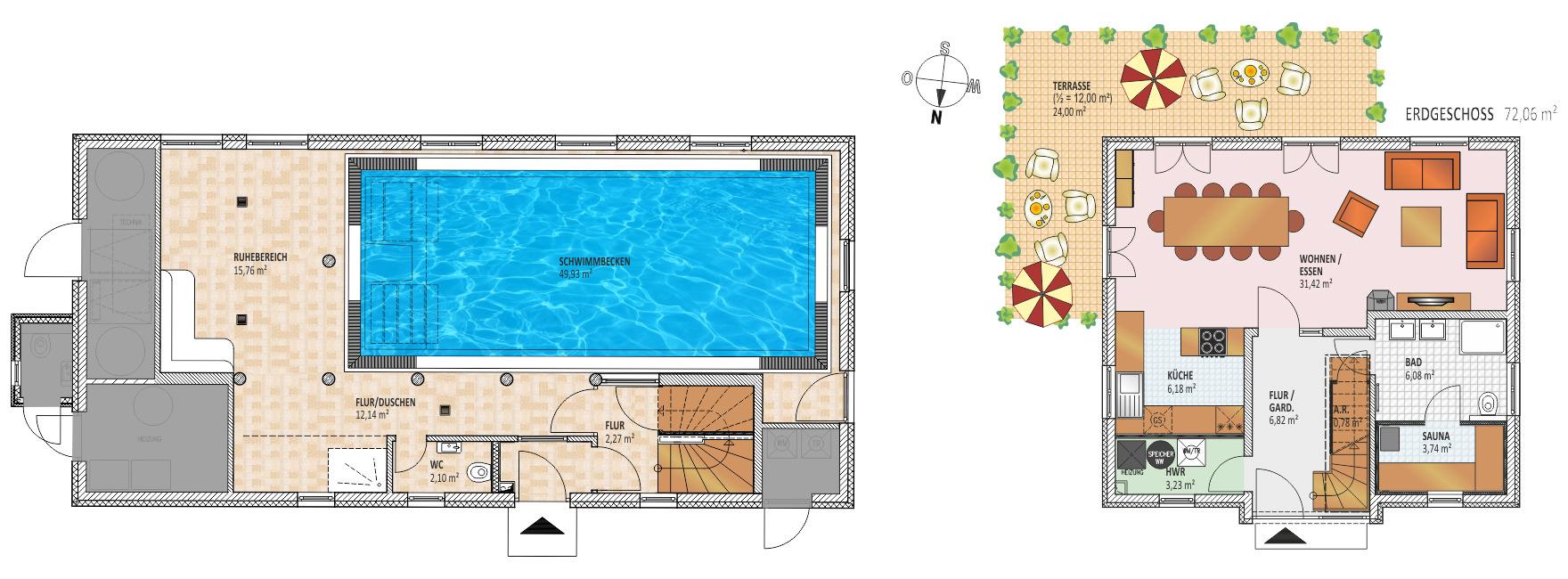 Ein verglaster Bademantelgang führt vom Obergeschoss des Reethauses in den oberen Bereich des Schwimmbades, wo Sie ein weiteres Schlafzimmer mit Doppelbett und Balkon finden. Hier stehen Ihnen auch eine Sauna (mit Münzer), ein Dampfbad (mit Münzer) und zwei große Bäder mit Duschen zur Verfügung. Das gesamte Erdgeschoss ist mit einem großzügigen 10 x 5 m Schwimmbecken ausgestattet, während Sie von überall einen malerischen Ausblick ins Grüne genießen können.