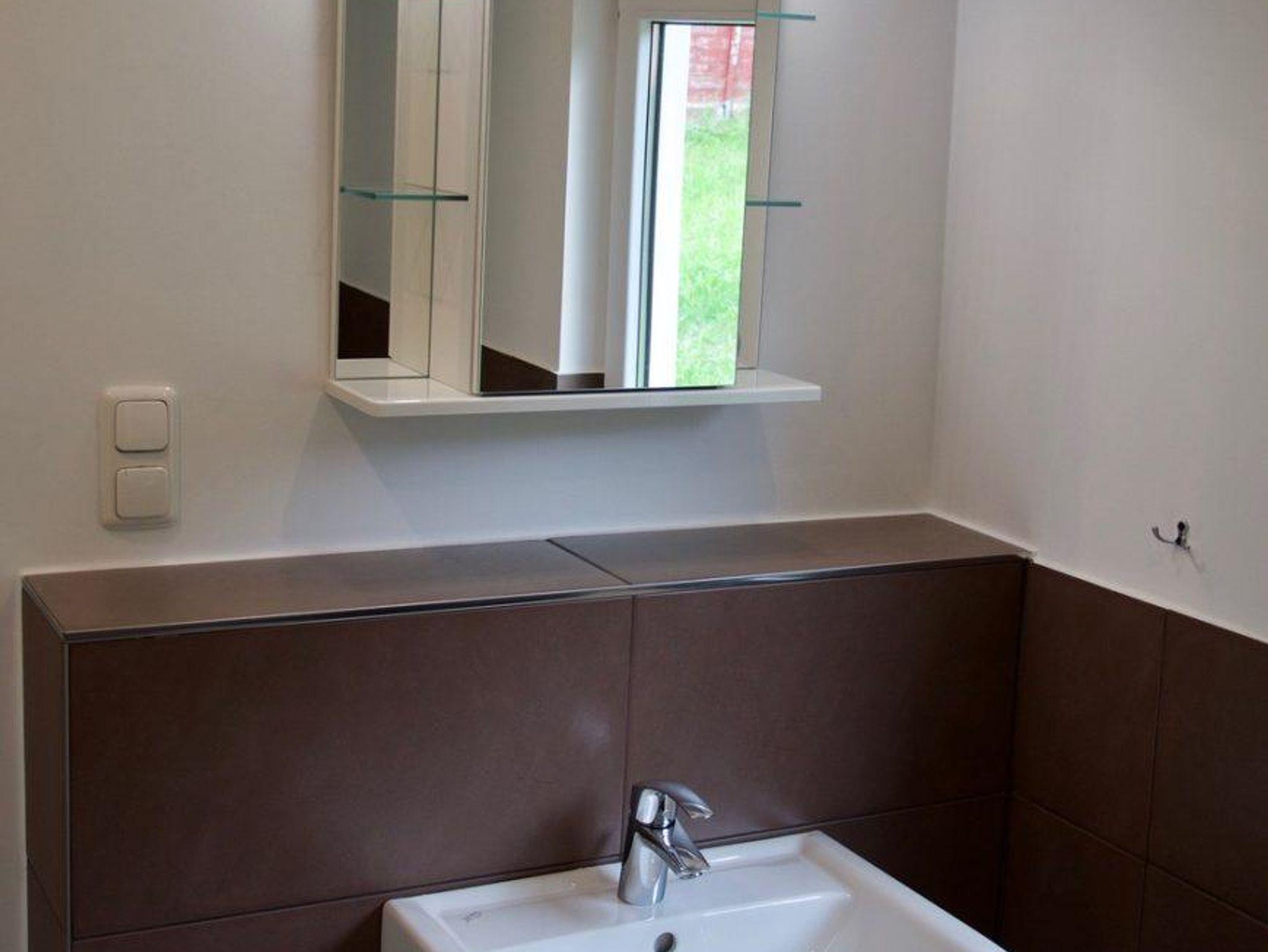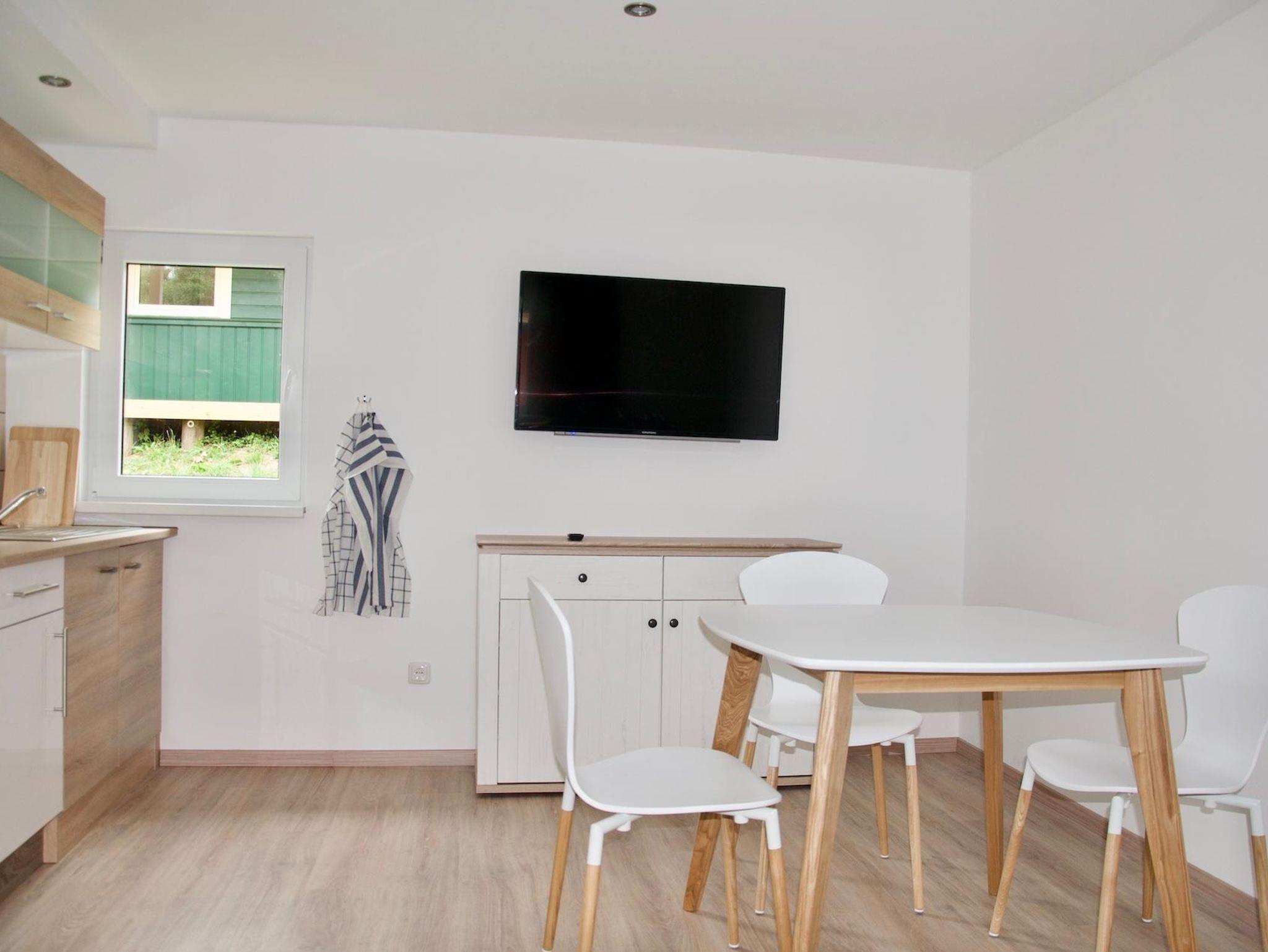 Die offene Wohnküche ist mit einem Kühlschrank, einem Herd mit Ceranfeld und einem Backofen sowie den wichtigsten Küchenutensilien ausgestattet. Ein Esstisch mit Stühlen, ein modernes Schlaf-Sofa, ein Couchtisch sowie ein Flachbildfernseher sorgen für Gemütlichkeit. Im Bad befindet sich eine ebenerdige Dusche, das WC und ein Waschbecken. Die überdachte Holzterrasse ist mit Stühlen und einem Tisch ausgestattet und lädt euch dazu ein, den vielen Vögeln im naheliegenden Wald zu lauschen.