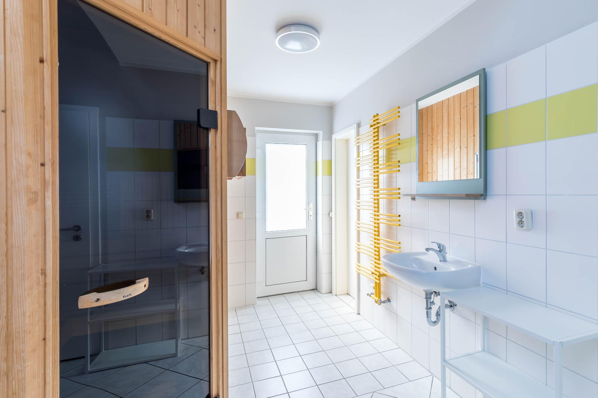 Zwei getrennte Badezimmer und zwei WCs sorgen für die nötige Entspannung im Familienurlaub. Die im Badezimmer integrierte Sauna darf gern genutzt werden.