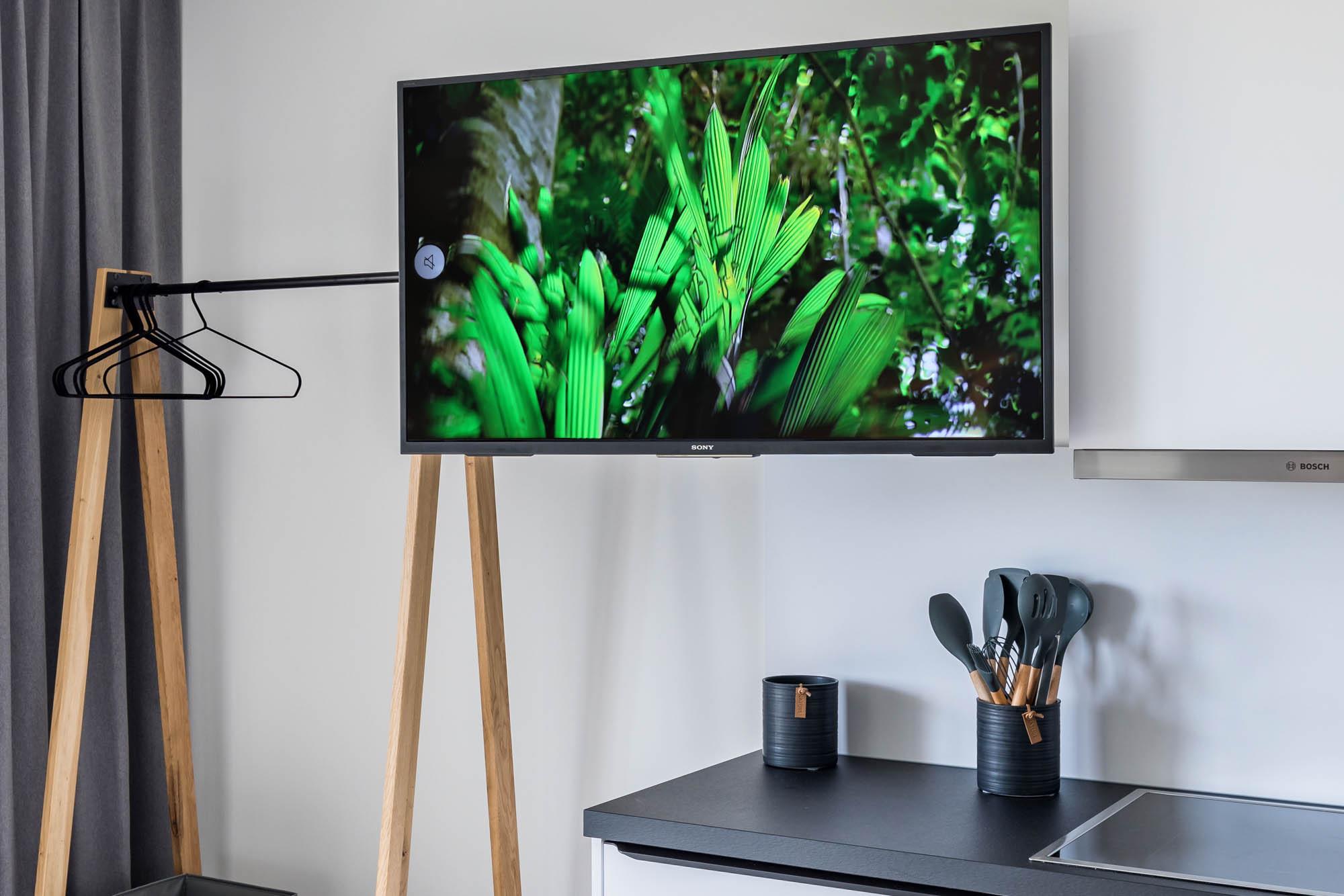 Der kombinierte Wohn- und Schlafraum bietet ein schönes Ledersofa sowie eine kleine separate Essecke. Weiterhin finden Sie ein modernes Boxspringbett (180x200m) und einen Kleiderschrank. Sowohl von dem Soda als auch vom Bett aus können Sie bequem auf den Flatscreen-TV schauen.