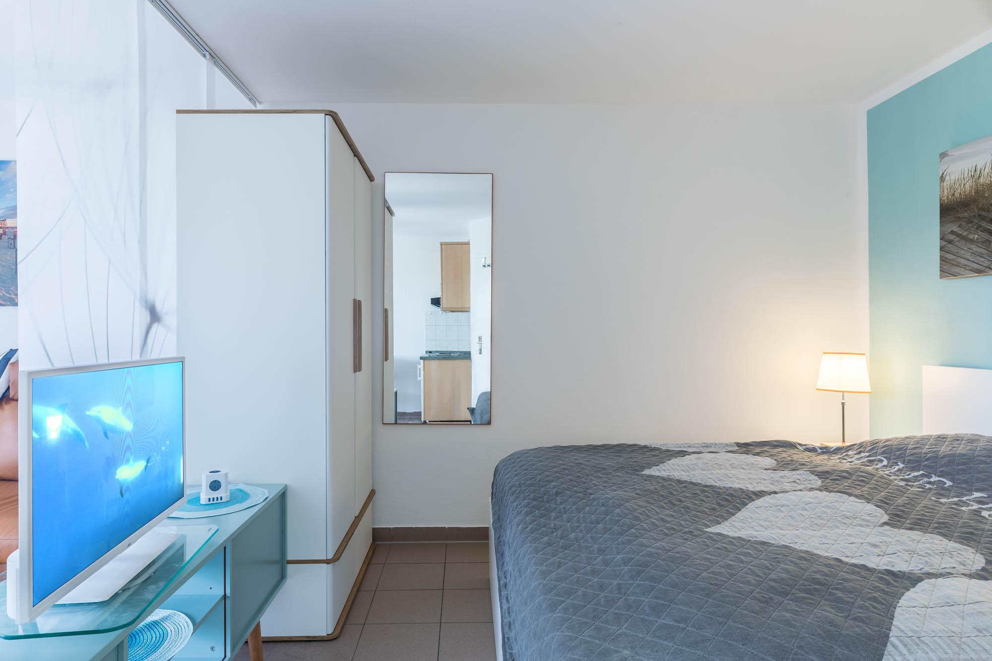 Das große Doppelbett sorgt für erholsamen Schlaf, für die optische Abtrennung zum Wohnbereich sorgt ein schöner Schiebe-Vorhang. Auch ein 2-türiger Kleiderschrank für Ihre Urlaubsgarderobe sowie ein Spiegel haben hier ihren Platz gefunden.