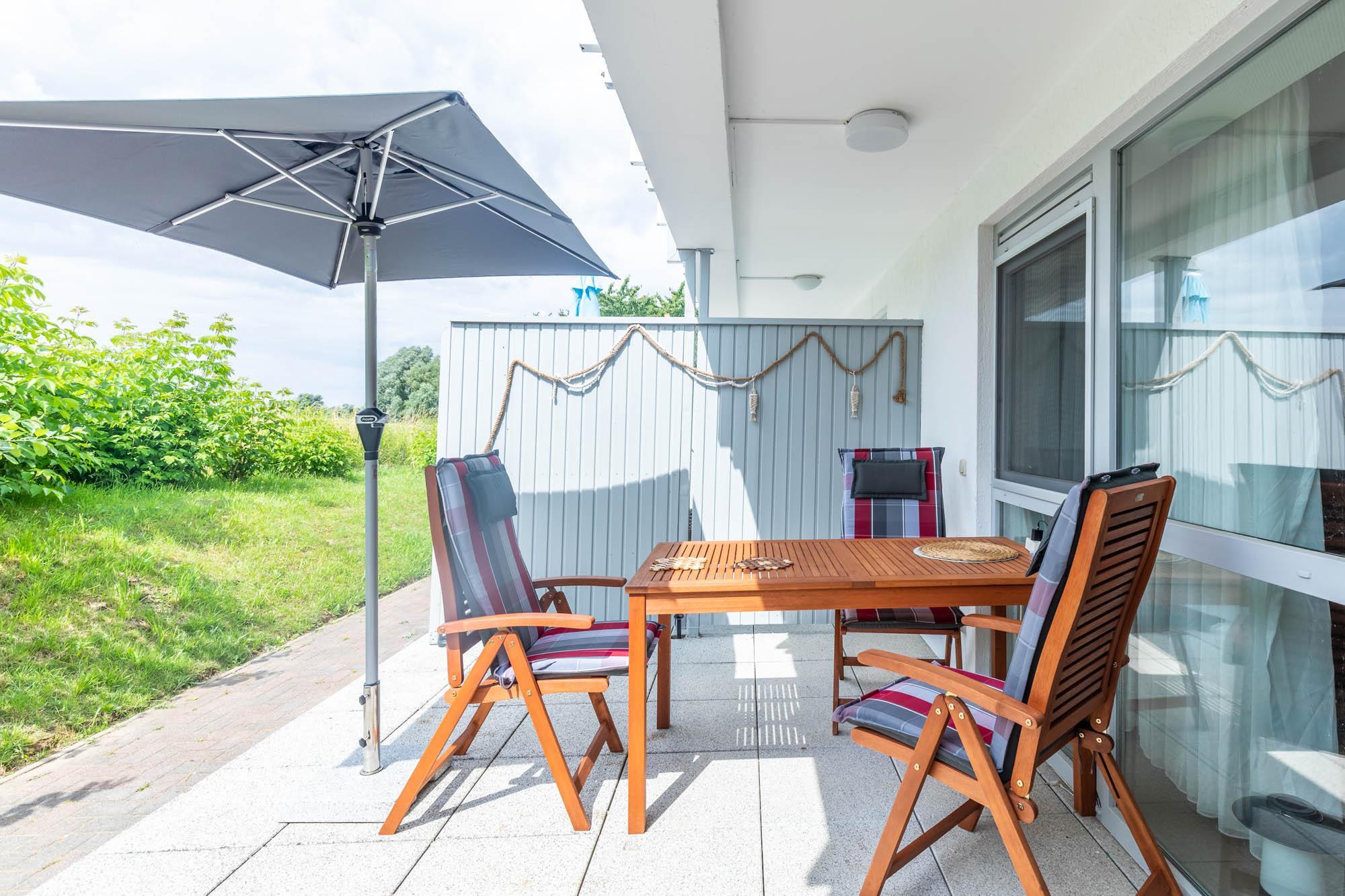 Die große Südterrasse mit Gartenmöbeln rundet die Ausstattung ab.
