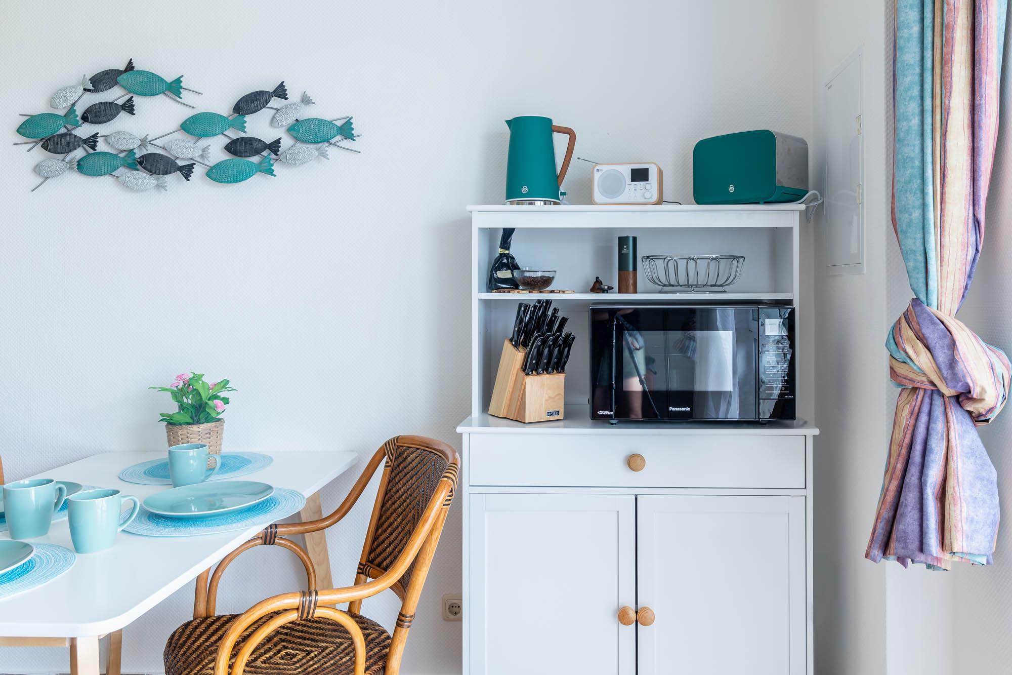 Wohn, Schlaf- und Essbereich sind offen miteinander verbunden, eine kleine Singleküche mit angeschlossener Essecke reihen sich hervorragend ein. Die moderne und gemütliche Einrichtung sorgt mit ihren frischen Meeresfarben für herrliche Urlaubsstimmung. Der Flatscreen-TV befindet sich mittig zwischen dem Wohnbereich und Schlafbereich und kann somit durch einfaches Drehen von beiden Bereichen genutzt werden. Die bequeme Couch bietet bei Bedarf eine dritte Schlafmöglichkeit.