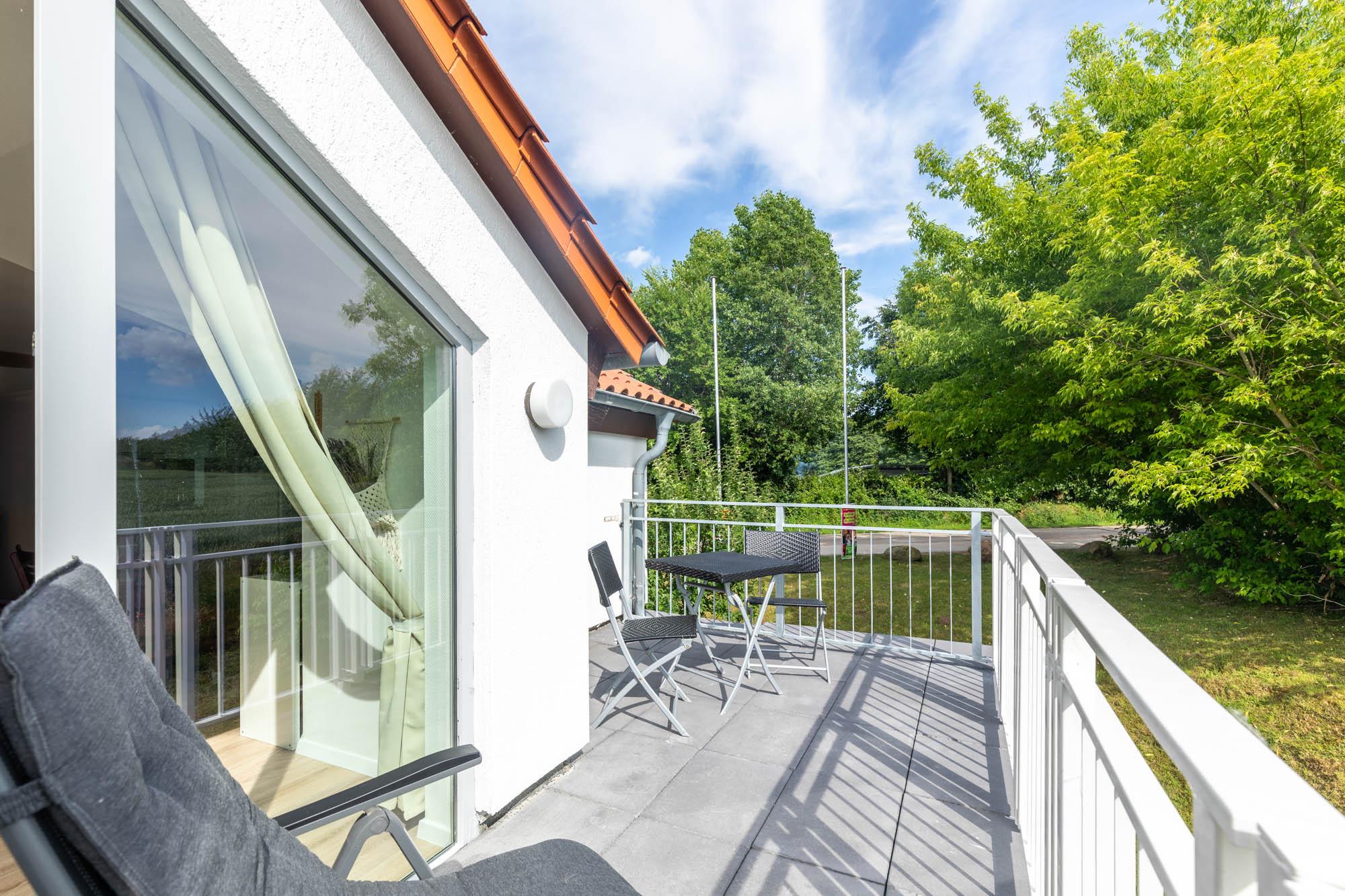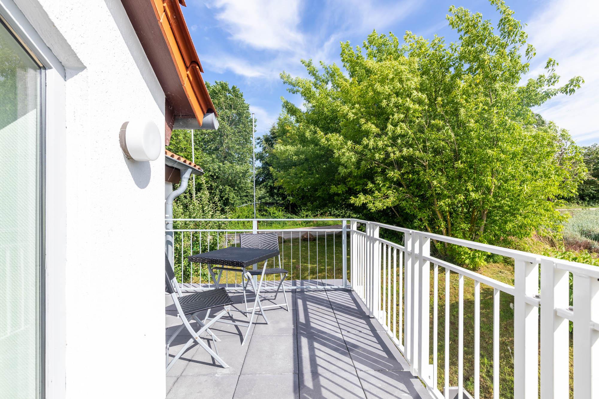 Von hier aus begehen Sie auch den möblierten Südbalkon mit Blick ins Grüne.
