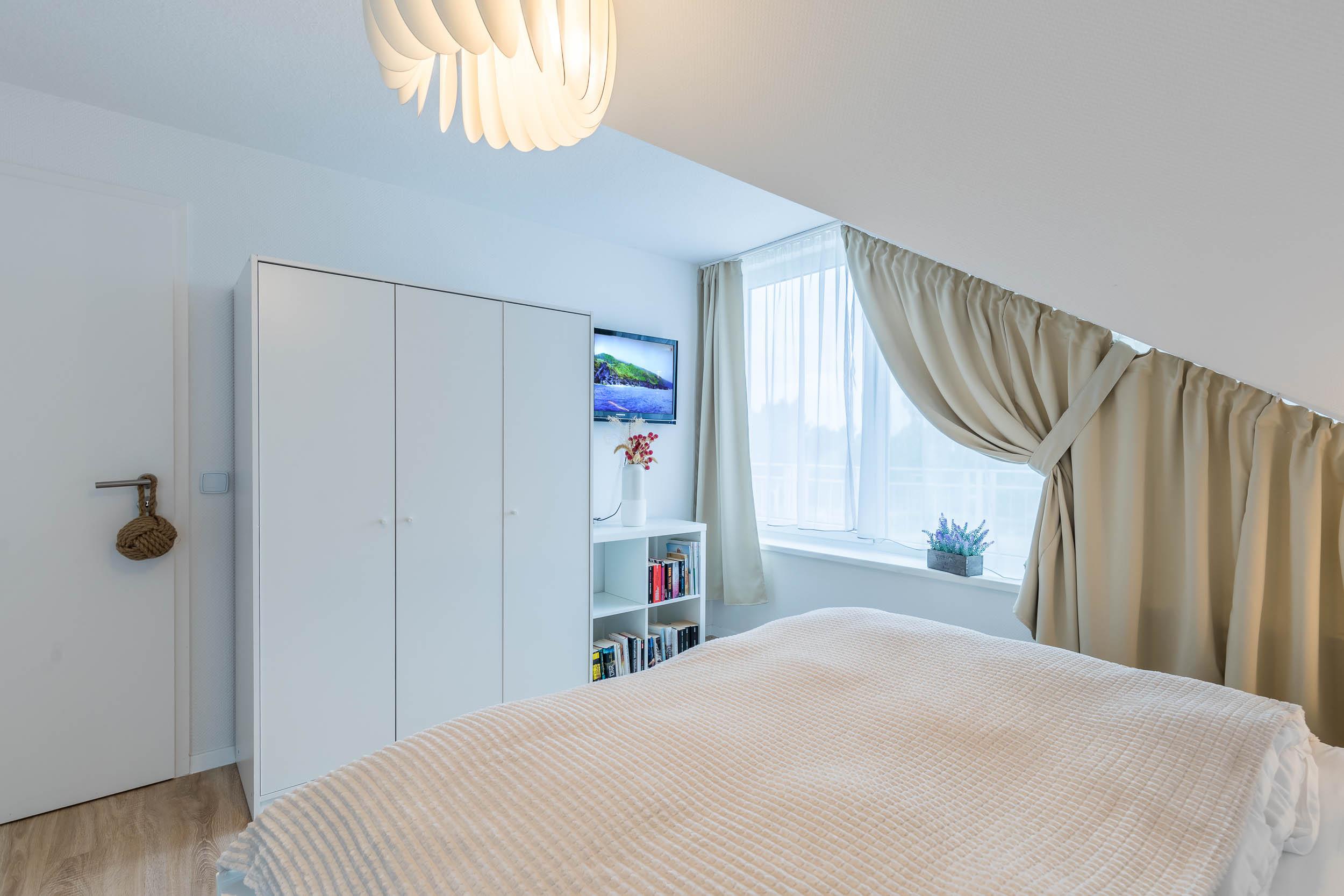 Das Schlafzimmer, welches sich auf selbiger Ebene befindet, ist mit einem gemütlichen Doppelbett und Flatscreen-TV ausgestattet. Auch ein festes Holzgitterbett mit Matratze für unsere kleinsten Gäste steht hier bereit. Im großen Kleiderschrank können Sie gern Ihre Urlaubsgarderobe ablegen.