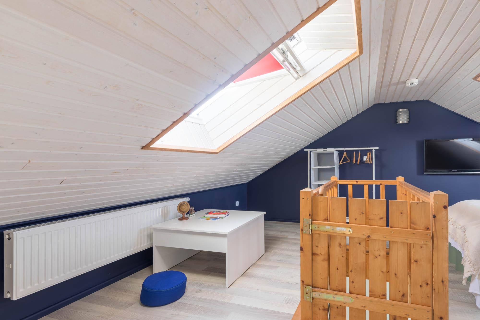 Vom Wohnbereich aus gelangen Sie über eine Raumspartreppe ins offene Dachgeschoss. Dieser Bereich ist eher für größere Kinder geeignet, aber die Einzelbetten können auch von Erwachsenen genutzt werden. Ein eigener Flatscreen-TV an der Wand sorgt auch auf dieser Etage für Unterhaltung. Auch hier können auf einer Kleiderstange ein Teil der Urlaubsgarderobe aufbewahrt werden.
