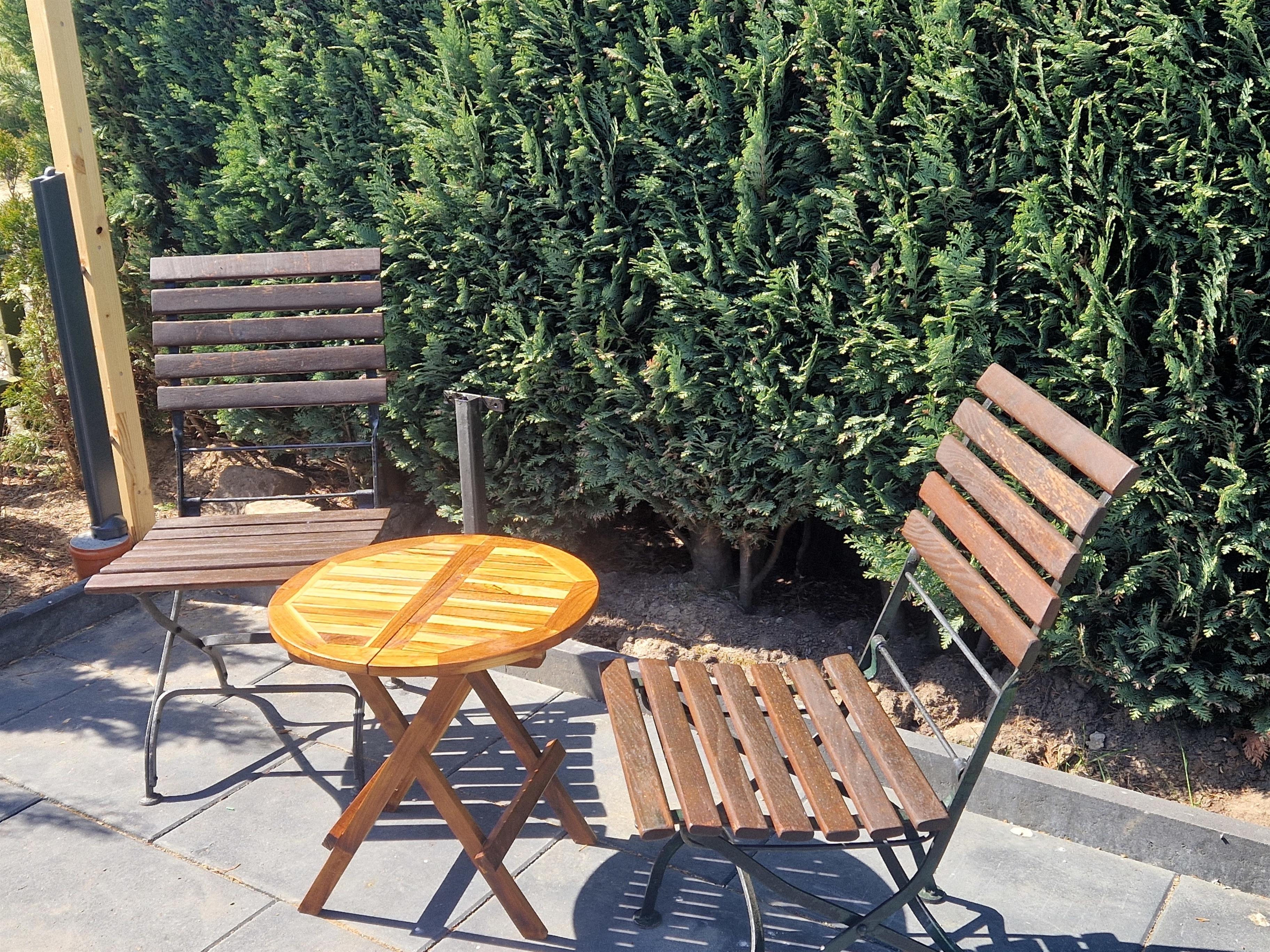 Zu dem Haus gehört eine 30 m2 große Terrasse mit angrenzender Rasenfläche zur alleinigen Nutzung. Die Sitzecke der Terrasse ist mit hochwertigen Teakmöbeln für 6 Personen ausgestattet. Eine elektrisch ausfahrbare Markise spendet im Sommer Schatten. 2 Sonnenliegen sowie ein Grill stehen zur Verfügung.