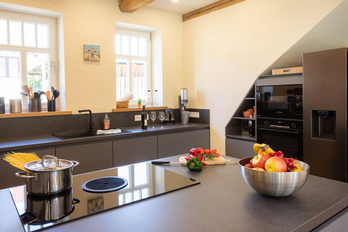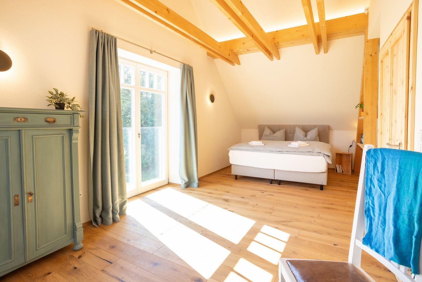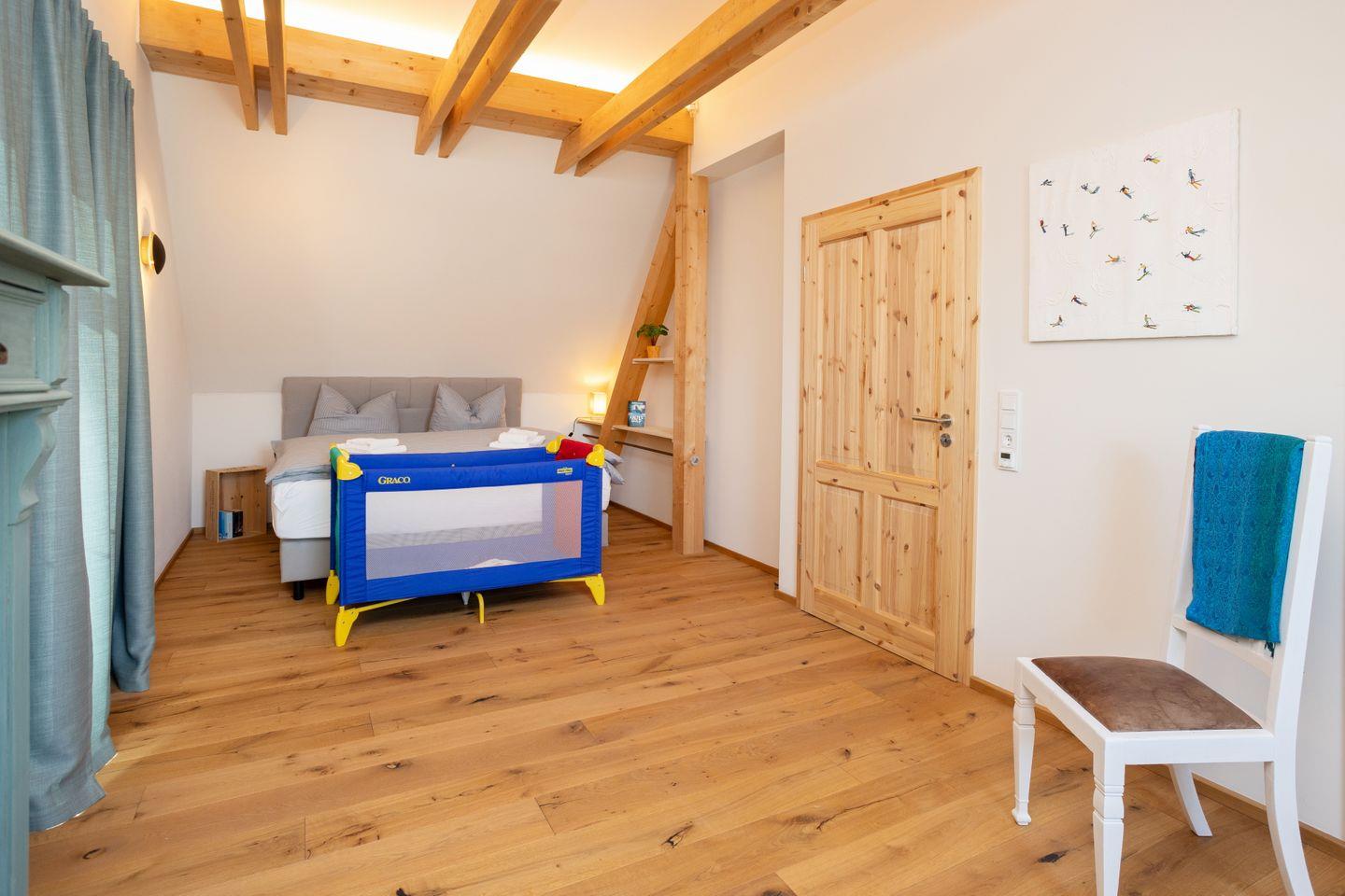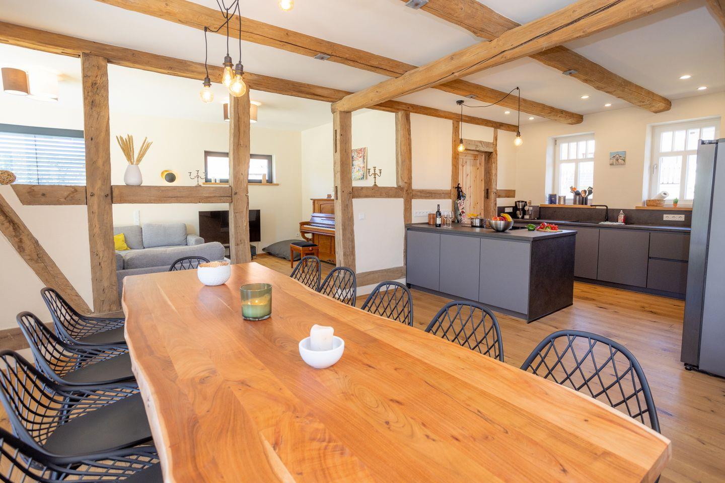 Drinnen erwarten euch 6 Schlafzimmer, ergänzt durch einen offenen Spitzboden mit zwei weiteren Betten. Zwei der Zimmer sind Durchgangszimmer, was besonders für Familien mit Kindern praktisch ist. Bei einer Einzelbelegung haben wir somit Platz für maximal 5 Personen. Dazu zwei stilvolle Bäder (eins mit Dusche, eins mit Dusche und freistehender Wanne), ein großer Wohnbereich mit Sofaecke und Klavier sowie eine moderne Küche mit allem, was ihr braucht. WLAN, Bluetooth-Box, TV und Fußbodenheizung sorgen für Gemütlichkeit – zu jeder Jahreszeit.