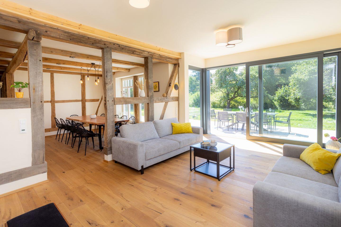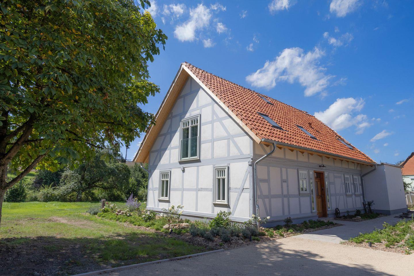 Der Neubau wurde mit originalem Fachwerk neu errichtet – so entsteht ein besonderes Wohngefühl zwischen Tradition und modernem Komfort.