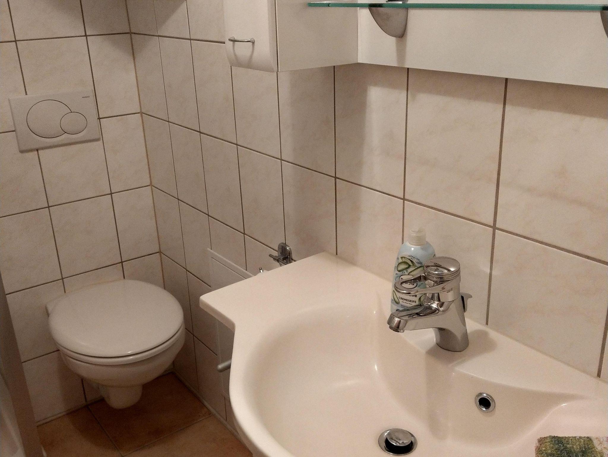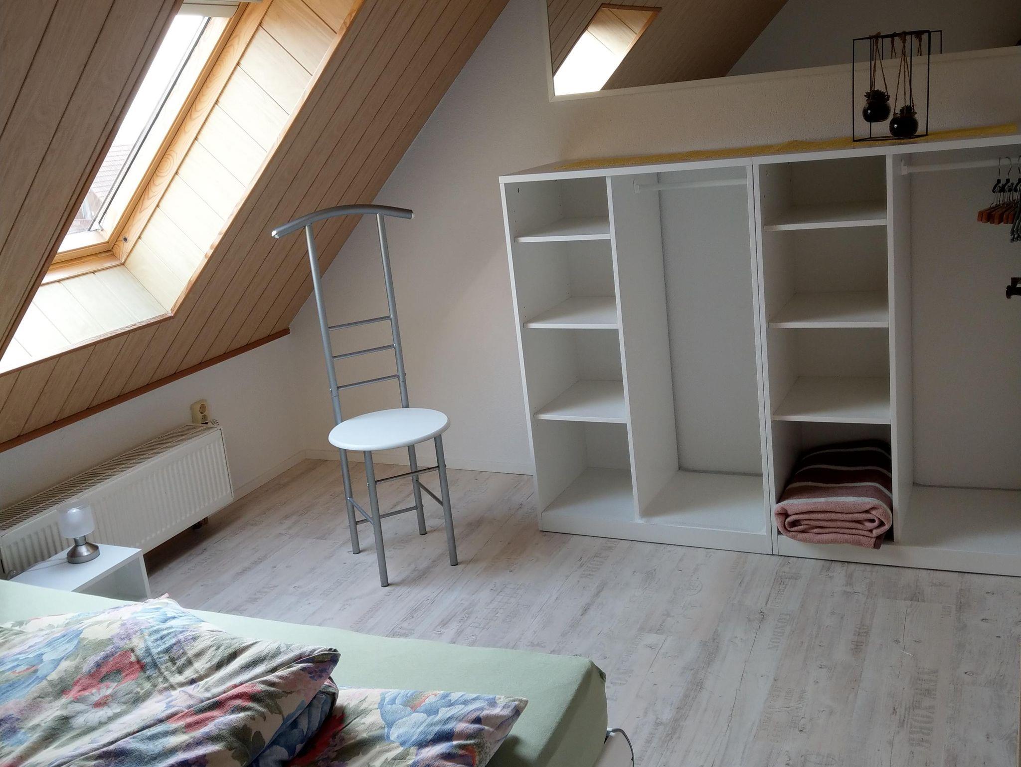 Unsere ca. 40 m² große Ferienwohnung ist auf zwei Etagen aufgeteilt. Im Erdgeschoss befindet sich der Wohnraum mit einem Essplatz für 4 Personen, einer gemütlichen Couch sowie einer Miniküche mit Kühlschrank, Mikrowelle, Toaster und Kaffeemaschine. Das kleine Bad verfügt über Dusche, WC, Waschtisch, Föhn und einen Handtuchheizkörper. Im Dachgeschoss sind 2 Schlafräume eingerichtet. Der Größere verfügt über ein Doppelbett, Kleiderschrank und Herrendiener. Im kleineren Schlafraum befinden sich zwei Einzelbetten, die durch einen Nachttisch getrennt sind sowie eine Wäschekommode.