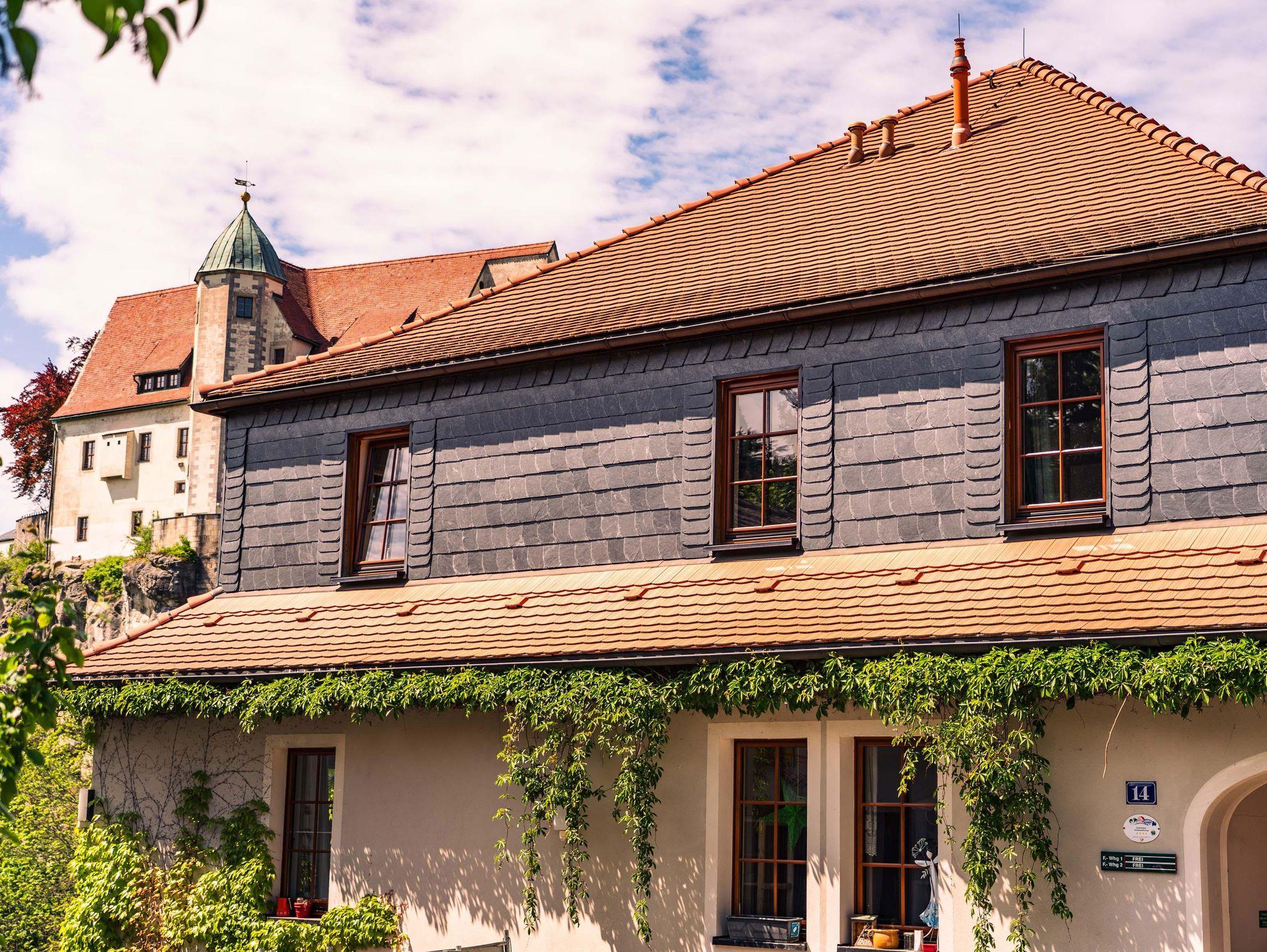 Es ist die Aussicht auf Burg und Felsenlandschaft des Nationalparks, die den Aufenthalt in unserer Ferienwohnung einmalig gestaltet. Vom Balkon sowie fast allen Zimmer hat man einen direkten Blick über den historischen Bärengarten, auf die Burg Hohnstein, das Felsenmassiv mit dem Gipfel Großer Halben und auch den berühmten Malerweg.