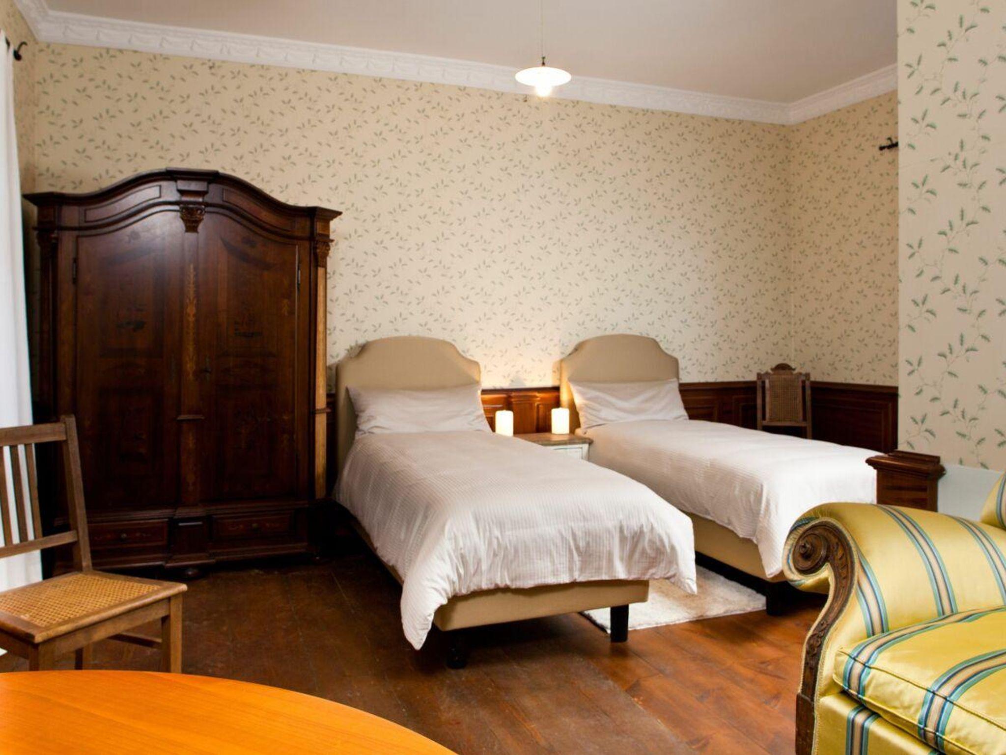 Die Ferienwohnung befindet sich im ehemaligen Kutscherhauses der Alten Försterei. Der Eingang ist ebenerdig und führt in einen Vorraum mit Abstellmöglichkeit für Koffer und Garderobe. Über den Treppenaufgang gelangen Sie zu den 2 Schlafzimmern mit je 2 Einzelbetten, welche jeweils über ein eigenes Badezimmer verfügen, eins davon mit Bidet. Die Küchenzeile ist mit einem Gasherd (2 Flammen), kleiner Geschirrspülmaschine, Mikrowelle und einem Essplatz für 2 Personen ausgestattet. Bei Anreise von 3 und 4 Personen ist der Essplatz in einem der Wohn-Schlafräume vorhanden.