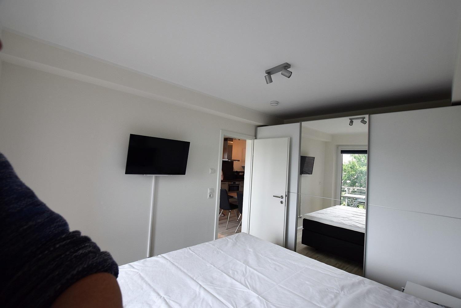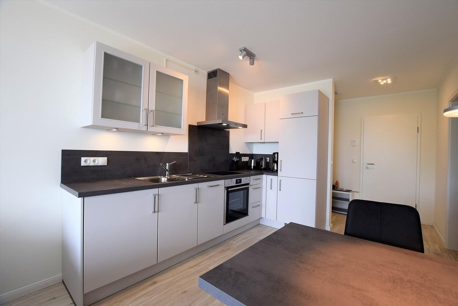 Die Ferienwohnung „Strandperle“ befindet sich im 2. Stock und bietet auf 52 m² eine hochwertige Innenausstattung mit Fußbodenheizung und bodentiefen Fenstern. Der offene Wohn- und Essbereich ermöglicht den Blick aufs Meer und verfügt über eine großzügige Wohnlandschaft sowie einen großen Flachbild-Fernseher. Die moderne Küche ist komplett ausgestattet mit Spülmaschine, Waschmaschine, Ceranherd, Backofen, Kühlschrank mit Gefriermöglichkeit, Kaffeemaschine, Wasserkocher und Toaster. Zwei Schlafzimmer bieten Platz für bis zu vier Personen: ein großes Schlafzimmer mit Doppelbett (180x200 cm) und ein Kinderzimmer mit Etagenbett (80x200 cm). Das helle Badezimmer ist mit einer bodentiefen Dusche ausgestattet. WLAN und ein Internetanschluss sind kostenfrei verfügbar. Ein Fahrstuhl erleichtert den Zugang zur Wohnung, und es besteht die Möglichkeit zur Nutzung eines gemeinschaftlichen Fahrradabstellplatzes.