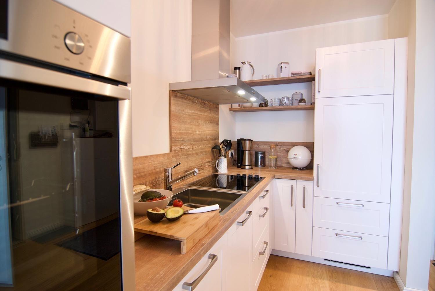 Die Einbauküche umfasst Herd, Backofen, Geschirrspüler, Waschmaschine und Kühlschrank mit Gefrierfach. Ein großzügiger Esstisch und eine gemütliche Couch mit einem Flatscreen-Fernseher runden den Wohnbereich ab. Das Schlafzimmer ist mit einem hochwertigen Boxspringbett (2,00 m x 2,00 m) und einem großen Kleiderschrank eingerichtet. Das helle Badezimmer bietet eine bodengleiche Dusche mit Echtglas-Duschabtrennung und einem unterfahrbaren Waschtisch. Gemeinschaftliche Einrichtungen wie ein Fahrrad-Gemeinschaftsraum sind ebenfalls vorhanden.