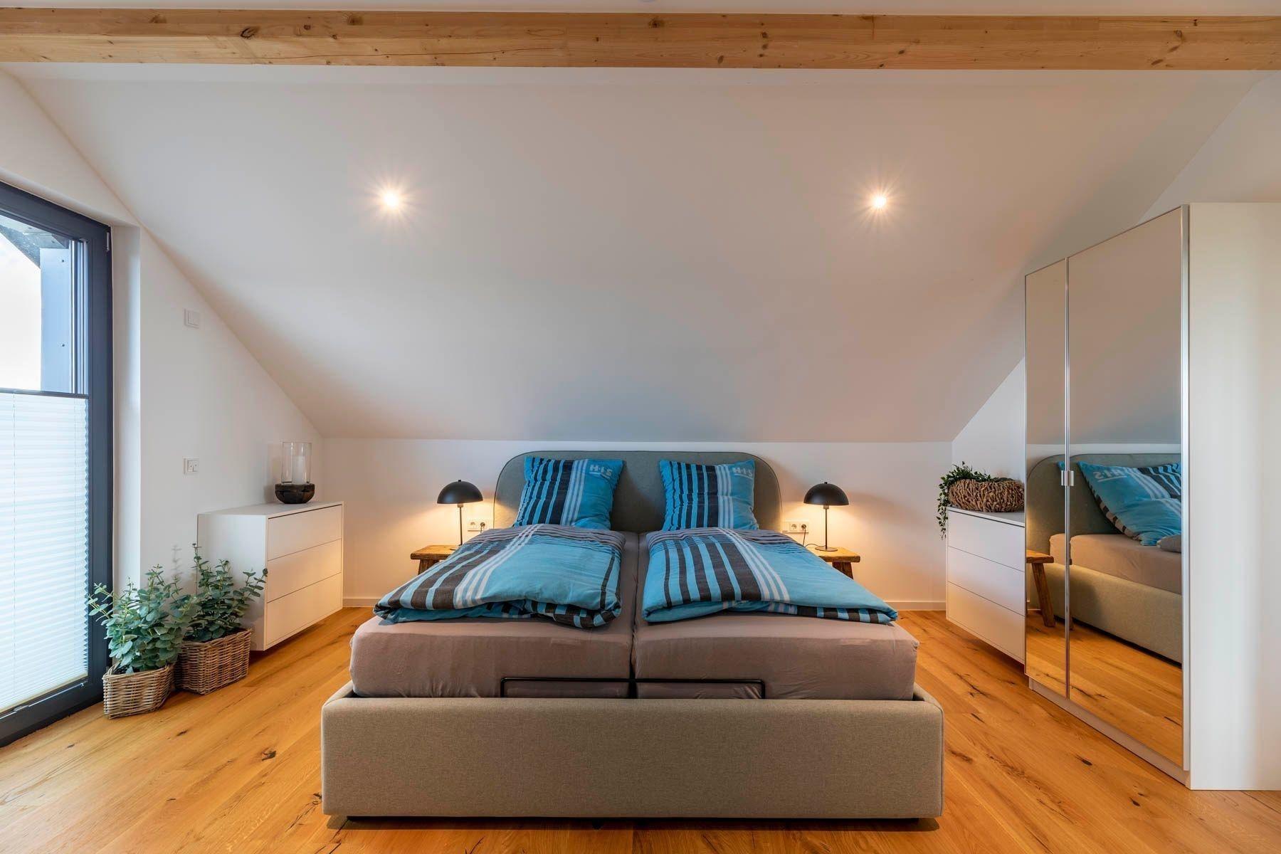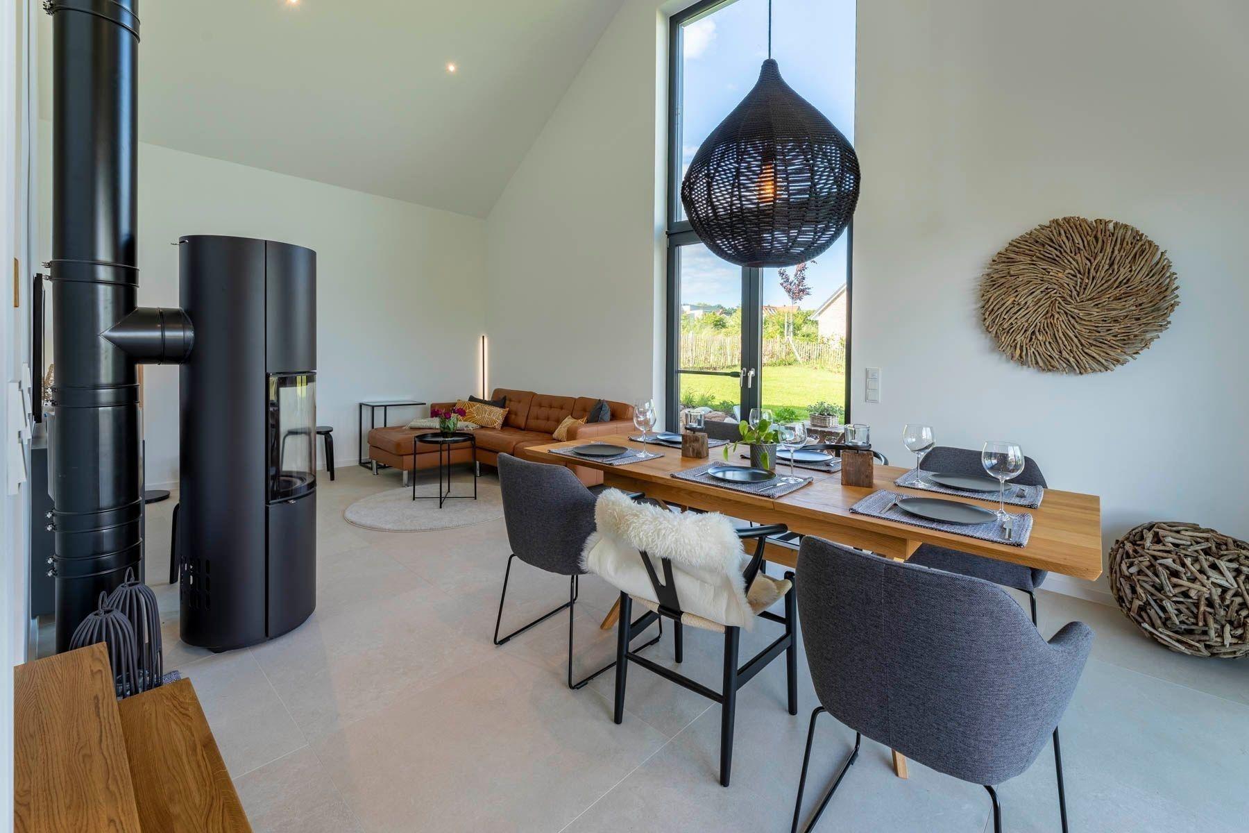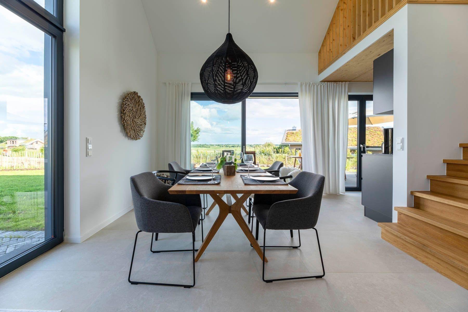Das Ferienhaus "Strandgänger Hohwacht" bietet auf etwa 110 Quadratmetern Platz für bis zu 6 Personen und zeichnet sich durch seine moderne Ausstattung aus. Im Erdgeschoss befinden sich ein ebenerdiges Schlafzimmer mit Doppelbett und zwei stilvolle Badezimmer, die mit bodentiefen Duschen und modernen Armaturen ausgestattet sind. Eine geräumige Küche mit hochwertiger Ausstattung, darunter ein Induktionskochfeld, Spülmaschine und großer Kühlschrank, lädt zum Kochen ein. Der helle Wohnbereich mit Kamin schafft eine einladende Atmosphäre. Im Obergeschoss befinden sich zwei weitere Schlafzimmer, eines mit Doppelbett und eines mit einem Einzelbett, das sich in ein Doppelbett umwandeln lässt. Die Sauna, die an das größere Badezimmer angrenzt, bietet zusätzlichen Komfort. WLAN und Glasfaseranschluss sind ebenfalls verfügbar. Ein Haustier ist auf Anfrage gestattet. Gemeinschaftliche Nutzung von Waschmaschine und Trockner im Hauswirtschaftsraum.