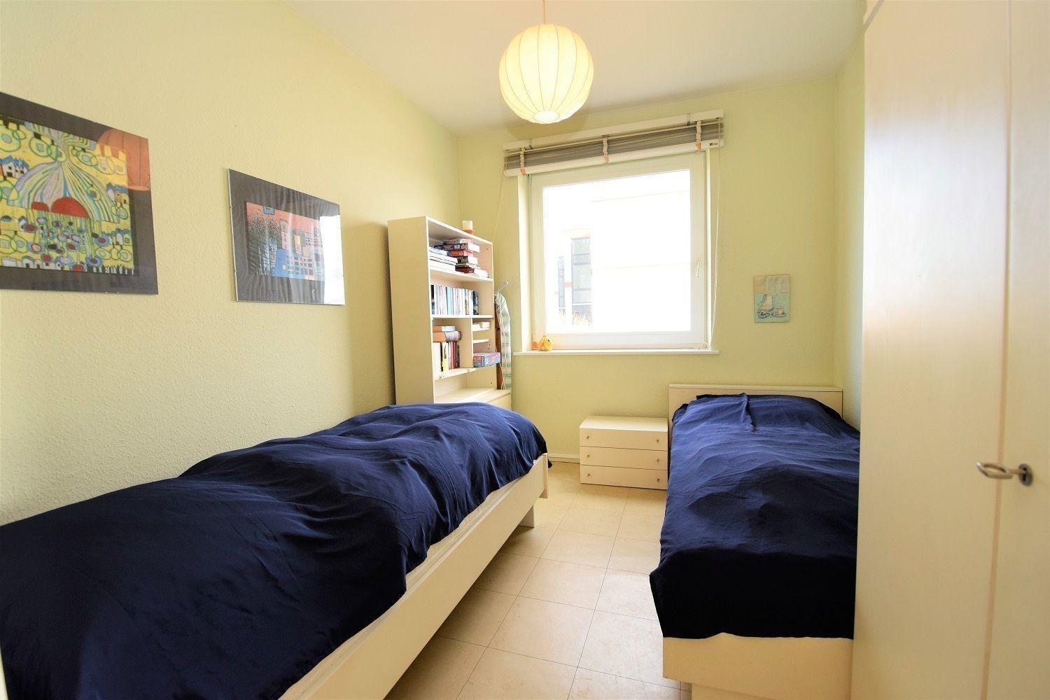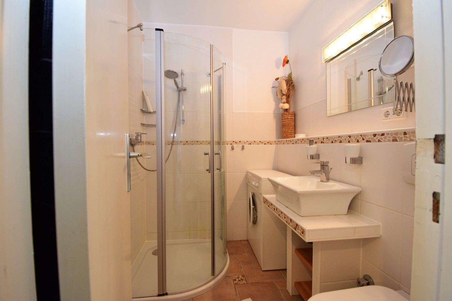 Zwei Schlafzimmer sorgen für erholsame Nächte: Ein Schlafzimmer mit einem komfortablen Doppelbett und ein weiteres mit zwei Einzelbetten. Das Badezimmer ist mit einer nahezu bodentiefen Dusche ausgestattet, die nach einem Tag an der Ostsee zur Entspannung einlädt.