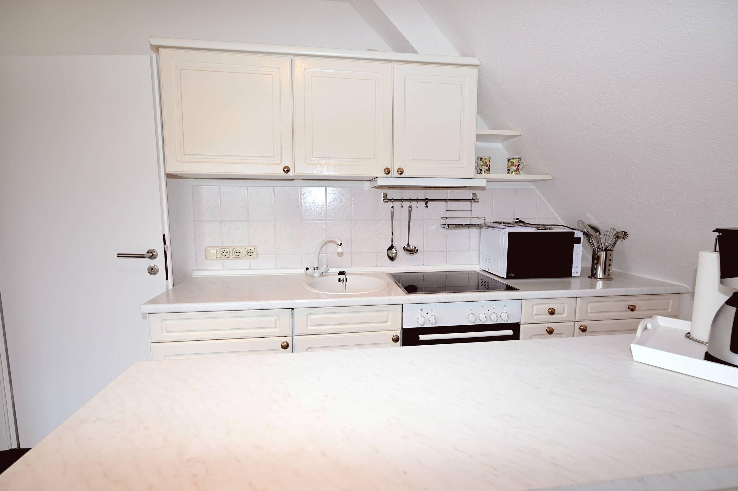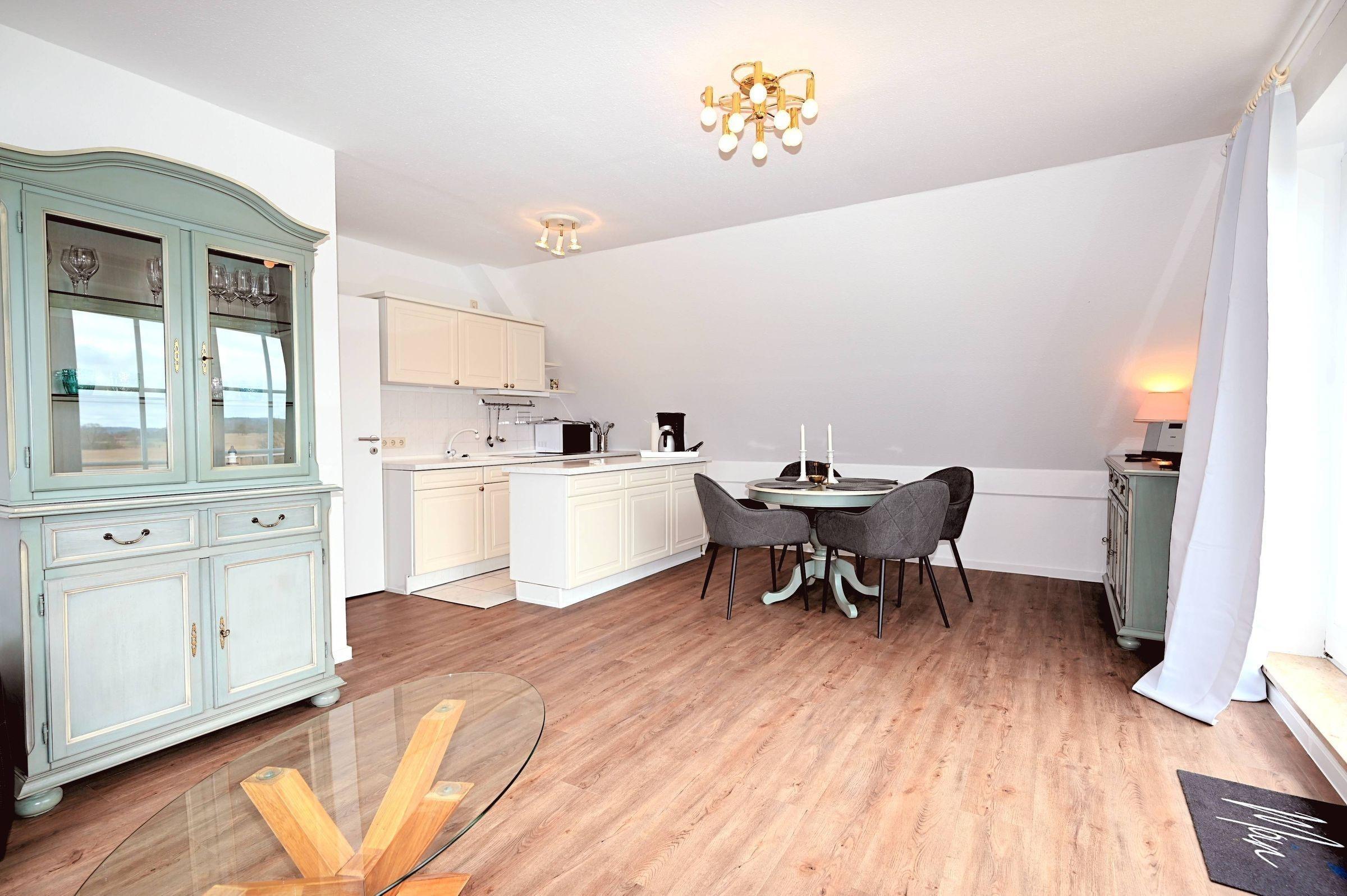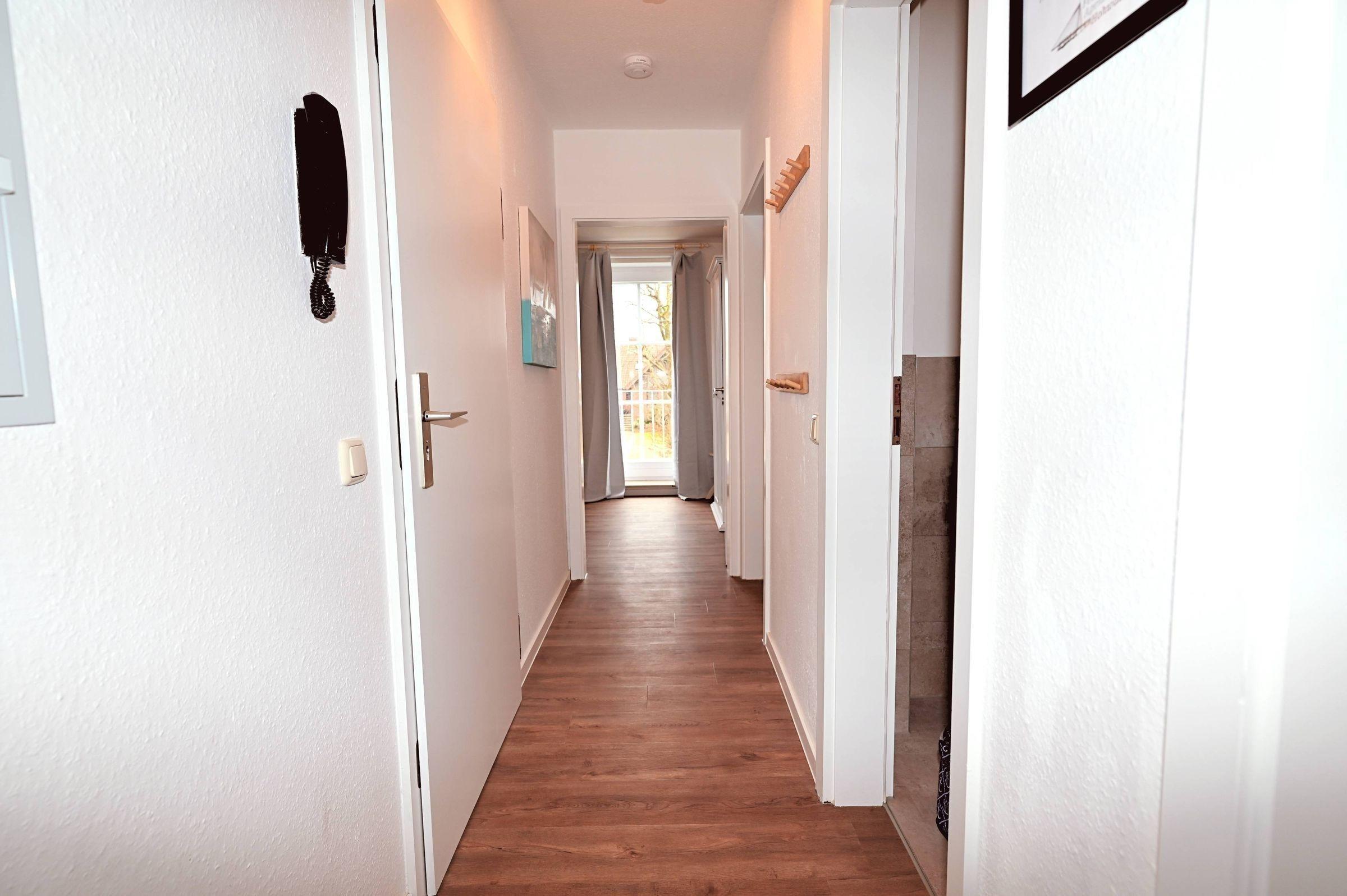 Die 3-Zimmer-Ferienwohnung bietet Platz für bis zu 4 Personen und überzeugt durch lichtdurchflutete Räume sowie hochwertige Ausstattung. Der offene Wohn- und Essbereich mit integrierter Küche ist mit einem Backofen, Mikrowelle, Kühlschrank mit Gefrierfach, Kaffeemaschine, Wasserkocher und Herd ausgestattet. Der einladende Wohnbereich umfasst ein gemütliches Sofa und einen bequemen Sessel. Die beiden Schlafzimmer sind mit komfortablen Doppelbetten, geräumigen Kleiderschränken und Verdunkelungsgardinen ausgestattet. Das moderne Badezimmer bietet eine ebenerdige Regendusche, WC, großen Spiegel und Tageslicht durch ein Veluxfenster. Für zusätzlichen Stauraum sorgen die großzügigen Schubladen unter dem Waschbecken. Eine Waschmaschine zur gemeinschaftlichen Nutzung ist im Keller des Hauses verfügbar. WLAN steht ebenfalls zur Verfügung. Ein Parkplatz befindet sich direkt vor dem Haus. Hunde sind nicht gestattet.