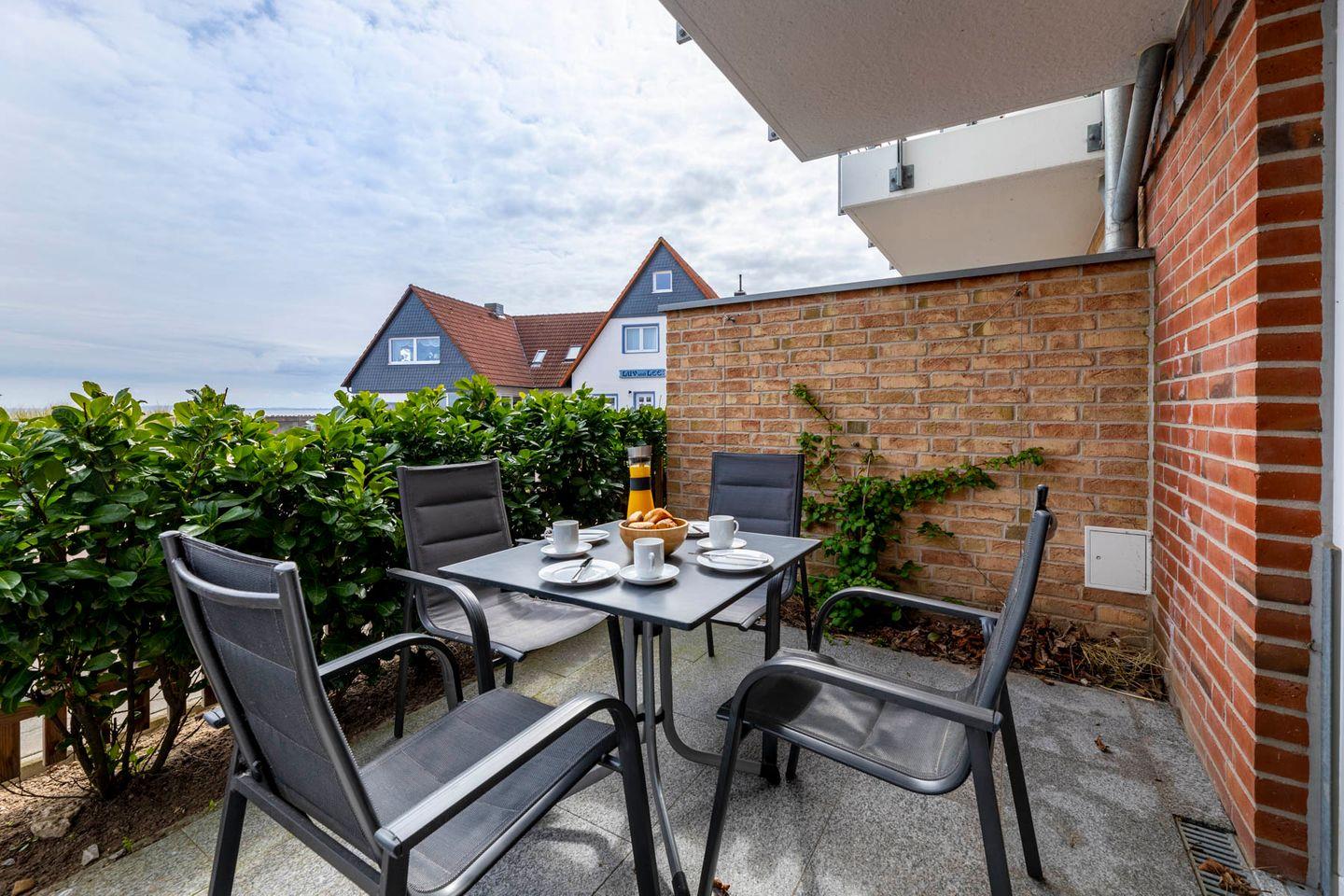 Zur Wohnung gehört eine nach Osten ausgerichtete Terrasse mit herrlichem Blick auf die Ostsee und ihre wunderschönen Sonnenaufgänge. Hier stehen Tisch und Stühle bereit, um die Zeit im Freien genießen zu können.