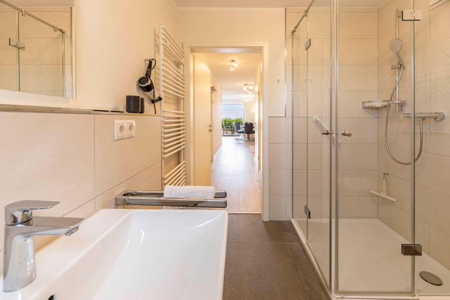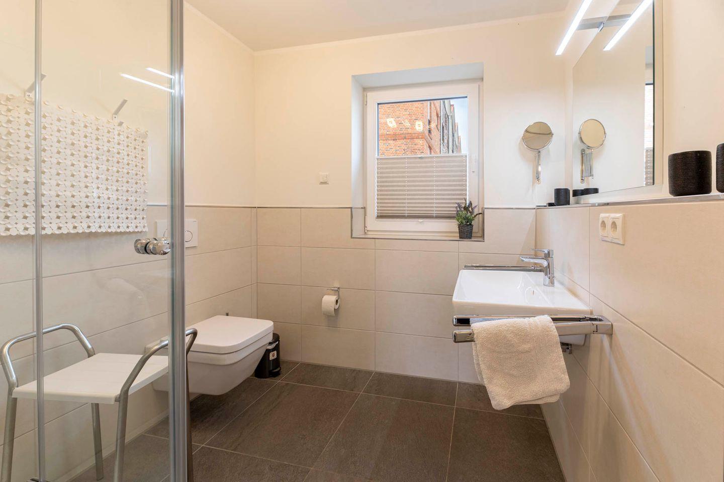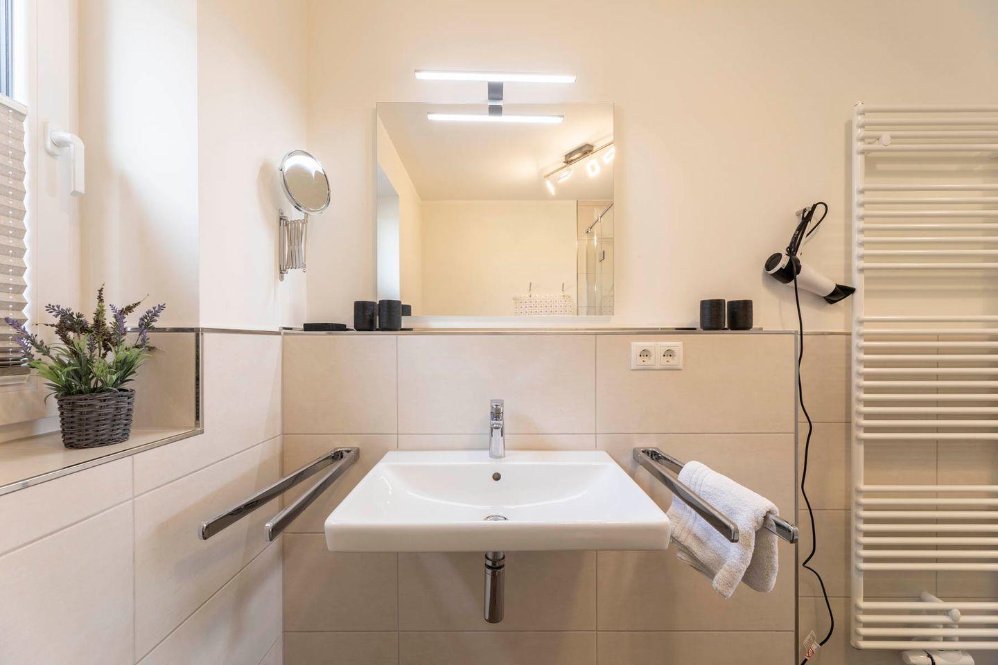 Diese Unterkunft verfügt über ein Vollbad mit Waschtisch, Dusche und WC. Die Beleuchtung mit Deckenspots und der Handtuchhalter sorgen für modernen Komfort.