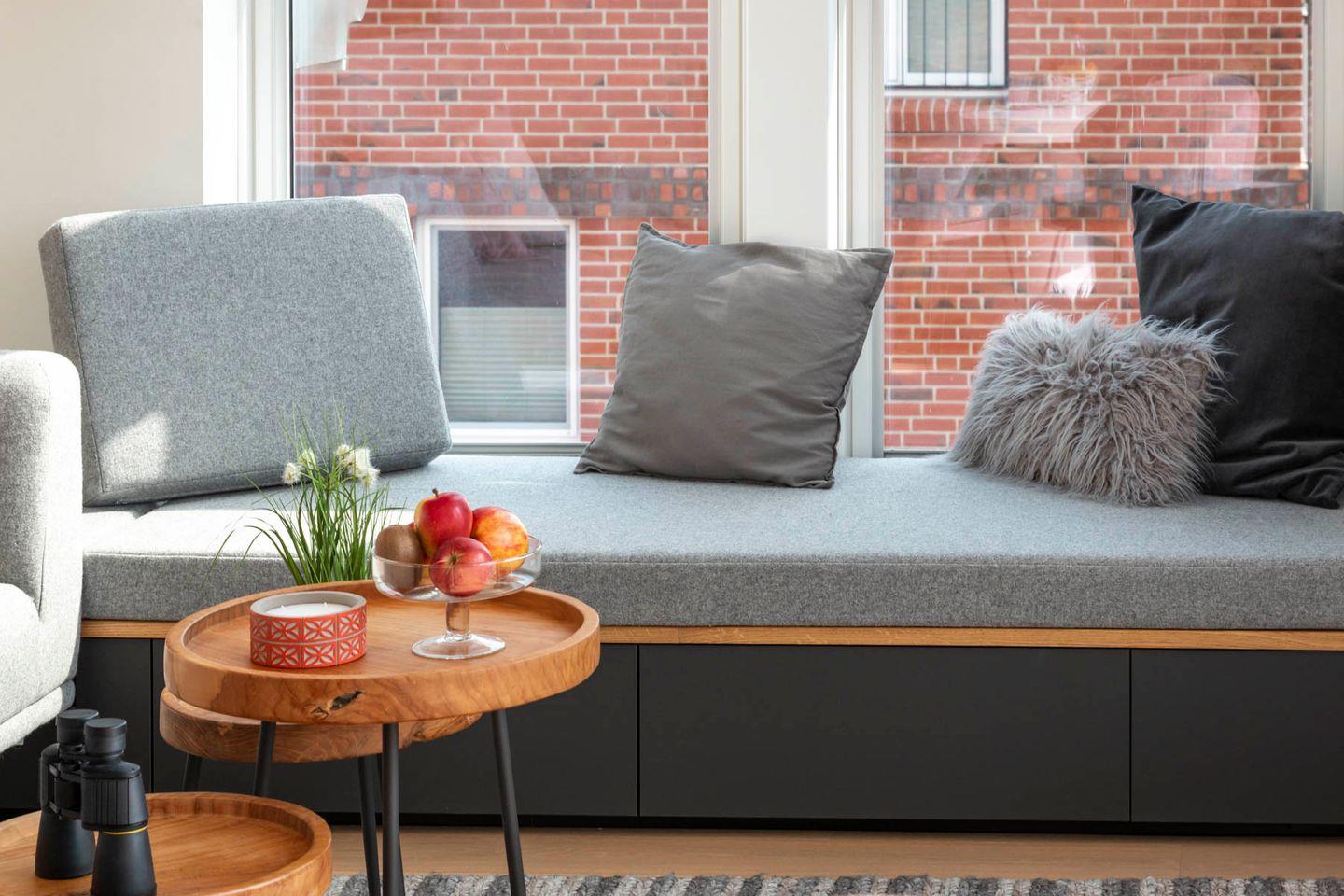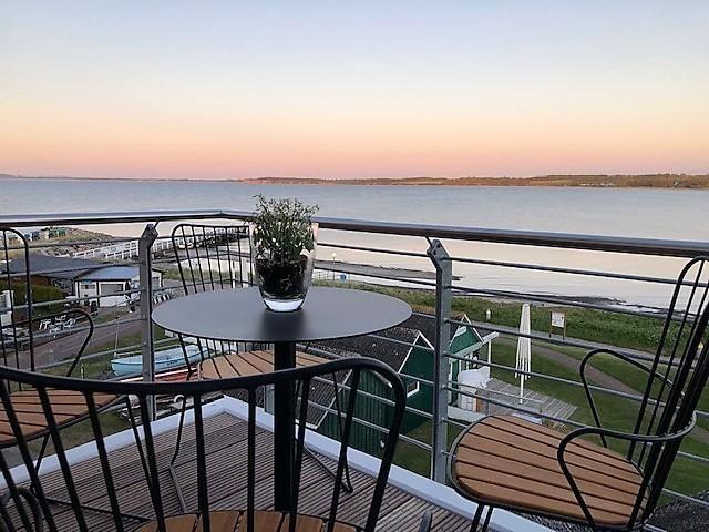 Der helle Wohnraum der Ferienwohnung "Meer" verfügt über zwei große Fensterfronten, die ebenso wie der große Balkon ein großartiges Panorama bieten. Im Wohnraum befinden sich das gemütliche Sofa und Esstisch, die nach einem langen Tag am Meer zum Entspannen einladen. Ein Fernseher sowie ein BOSE-Smart Speaker sorgen bei Bedarf für Unterhaltung.
