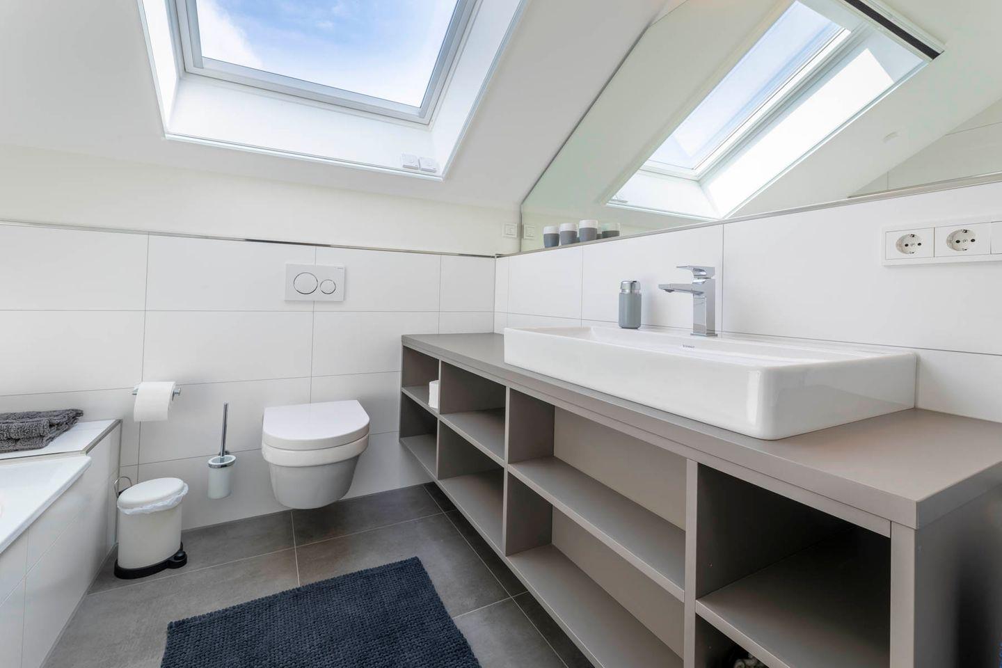 In der Wohnung stehen Ihnen zwei Badezimmer zur Verfügung. Das eine ist mit einer bodentiefen Dusche und das andere mit einer Badewanne mit Duschmöglichkeit ausgestattet. Helle Fliesen sorgen für einen modernen Gesamteindruck. Deckenspots, Waschtische mit großen Spiegeln sowie ein Fön sind hier ebenso vorhanden wie Handtuchwärmer.