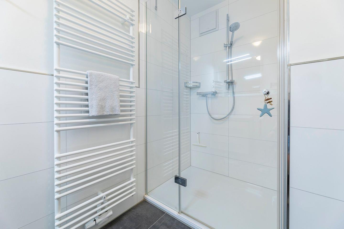 Direkt an das Schlafzimmer schließt das moderne Duschbad der Wohnung an. Die Dusche ist bodentief und lässt sich mit einer Glastür verschließen. Helle Fliesen sorgen für einen modernen Gesamteindruck. Deckenspots, ein Waschtisch mit großem Spiegel und ein Fön sind hier ebenso vorhanden wie ein Handtuchwärmer.