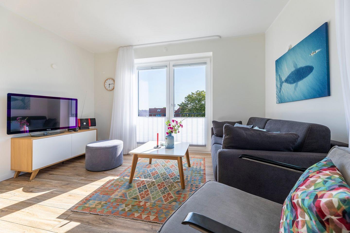 Der helle Wohnraum der Ferienwohnung "Große Freiheit" verfügt über eine große Fensterfront, hinter welcher sich der schöne Balkon der Wohnung erstreckt. Direkt davor befindet sich das gemütliche Sofa und ein Sessel, die nach einem langen Tag am Meer zum Entspannen einladen. Eine Fernseher runden den Wohnbereich ab.