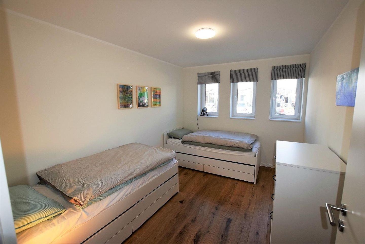 Die zwei Schlafzimmer mit großen Fenstern sind besonders hell, ein Schlafzimmer mit Doppelbett, und geräumigem Kleiderschrank. Das zweite Schlafzimmer verfügen über 2 Einzelbetten, die ausgezogen werden können sowie ebenfalls über einen Kleiderschrank.