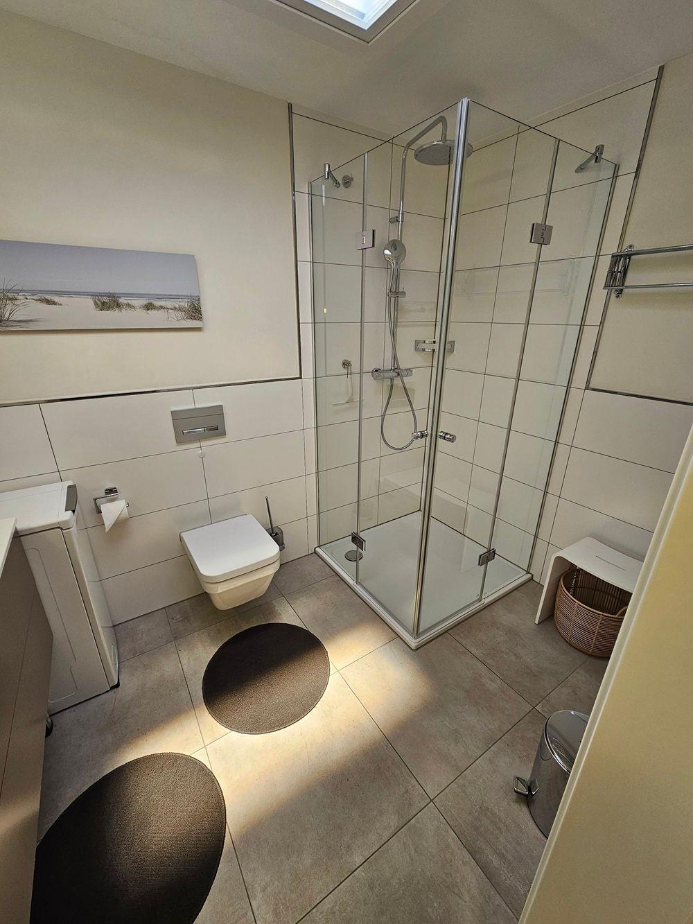 Das Bad mit traumhafter Regendusche und WC ist zusätzlich mit einem Waschtisch ausgestattet, welcher für viel Ablagefläche auch im Badezimmer sorgt. Deckenspots und ein Handtuchwärmer ergänzen die moderne Einrichtung. Eine Waschmaschine sorgt für zusätzlichen Komfort.