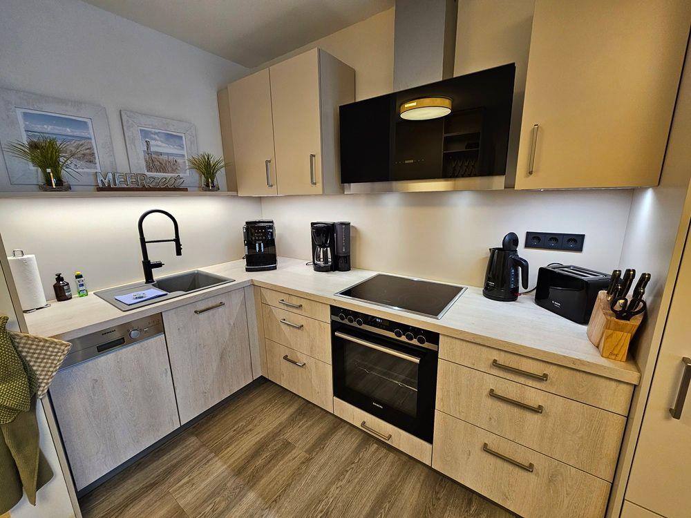 Der Essbereich mit Küche in L-Form verfügt zusätzlich über einen Essplatz mit Sitzplätzen für bis zu vier Personen. Die Küchenzeile ist modern und ansprechend. Zu den Ausstattungsdetails gehören hier eine Geschirrspülmaschine, der Herd mit Ceranfeld und Backofen, ein Kühlschrank inklusive Gefriermöglichkeit, und weitere Annehmlichkeiten wie z.B. ein Kaffeevollautomat.
