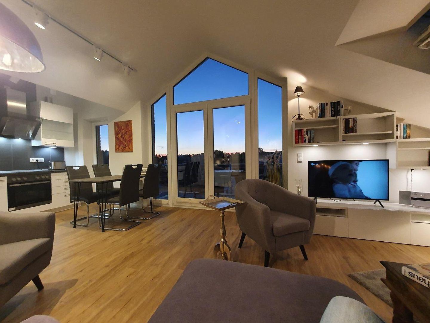 Fühlen Sie sich wohl in Ihrem Wohnzimmer mit Blick auf die Ostsee. Genießen Sie auf dem gemütlichen grauen Sofa einen Fernsehabend oder schauen Sie sich aus den großen Studiofenstern den einmaligen Sonnenuntergang über der Hohwachter Bucht an. Hier sind alle Möbel aufeinander abgestimmt. Vom kleinen grauen Cocktailsessel mit antiksilbernen Beistelltisch, bis zum handgefertigten antiken Wohnzimmertisch. Vom beleuchteten Lowboard über den ledernen Zeitungshalter, bis zur antiksilbernen Leselampe. Selbstverständlich sind alle Bilder in der Wohnung handgemalte Originale oder Originalfotografien.