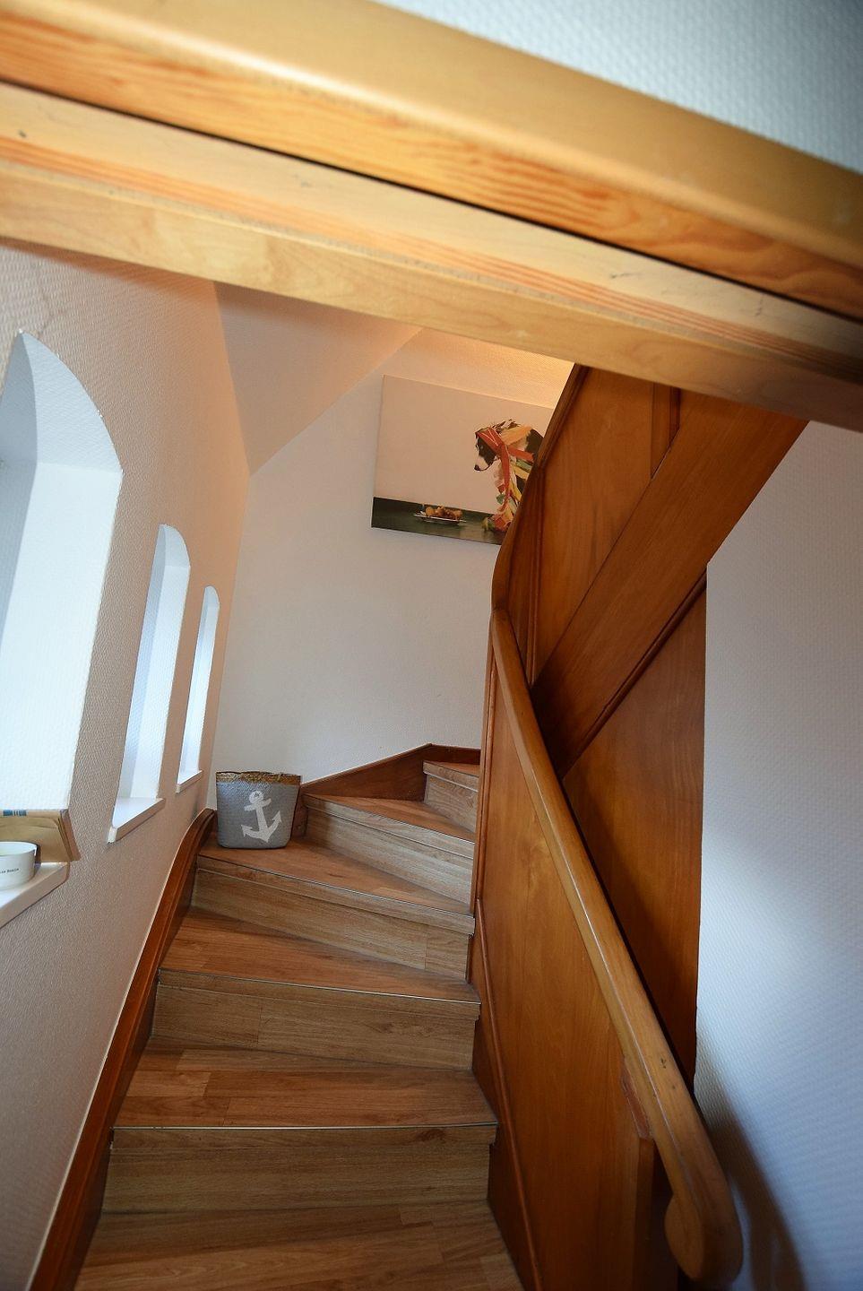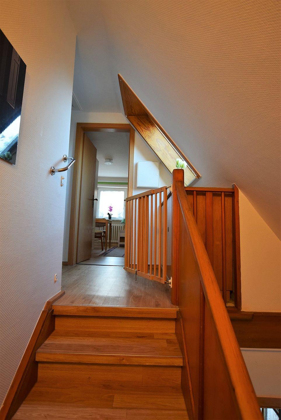 Entlang einer schön mit Holz verkleideten Treppe steigt man hinauf in das Obergeschoss des Hauses Vineta. Alle Zimmer verteilen sich rechts und links entlang eines längeren Flures. Durch viele und großzügige Fenster, vor allem im Wohnbereich werden Sie mit Tageslicht begrüßt und fühlen sich gleich herzlich Willkommen.