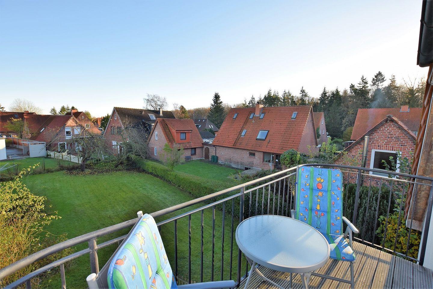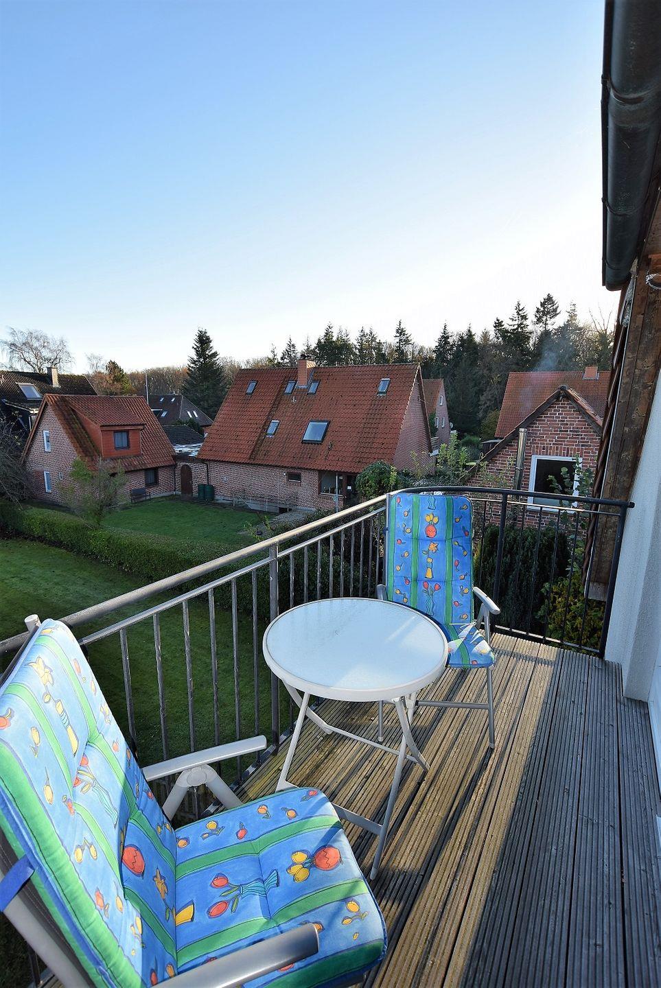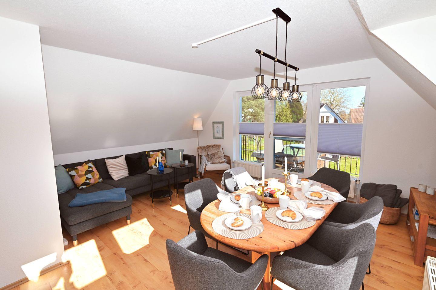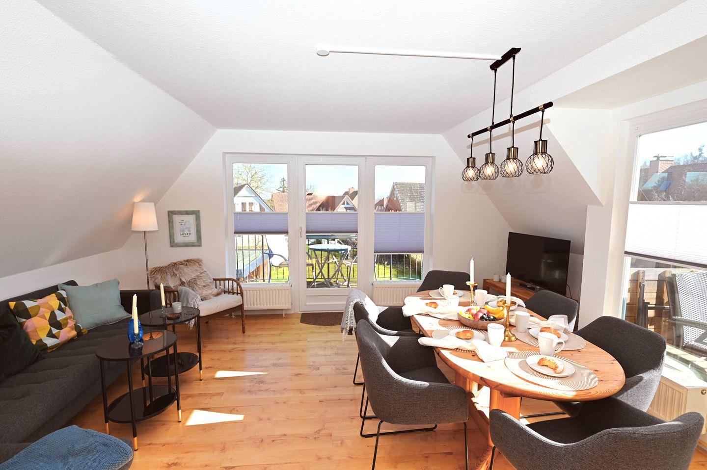 Der großzügige Wohn- und Essbereich, der für 6 Personen Platz bietet grenzt an die offene Küche. Die Räumlichkeiten sind liebevoll eingerichtet und punkten mit viel Komfort und Gemütlichkeit. Durch den Smart-TV lassen sich hier auch am Abend oder bei Schietwetter schöne und gemütliche Stunden verbringen. Die Balkone sind durch große Fenster zu erreichen, die reichlich Tageslicht in den Raum dringen lassen. Der Süd- und Westbalkon lädt vor allem im Sommer mit Mobiliar zum Verweilen ein.