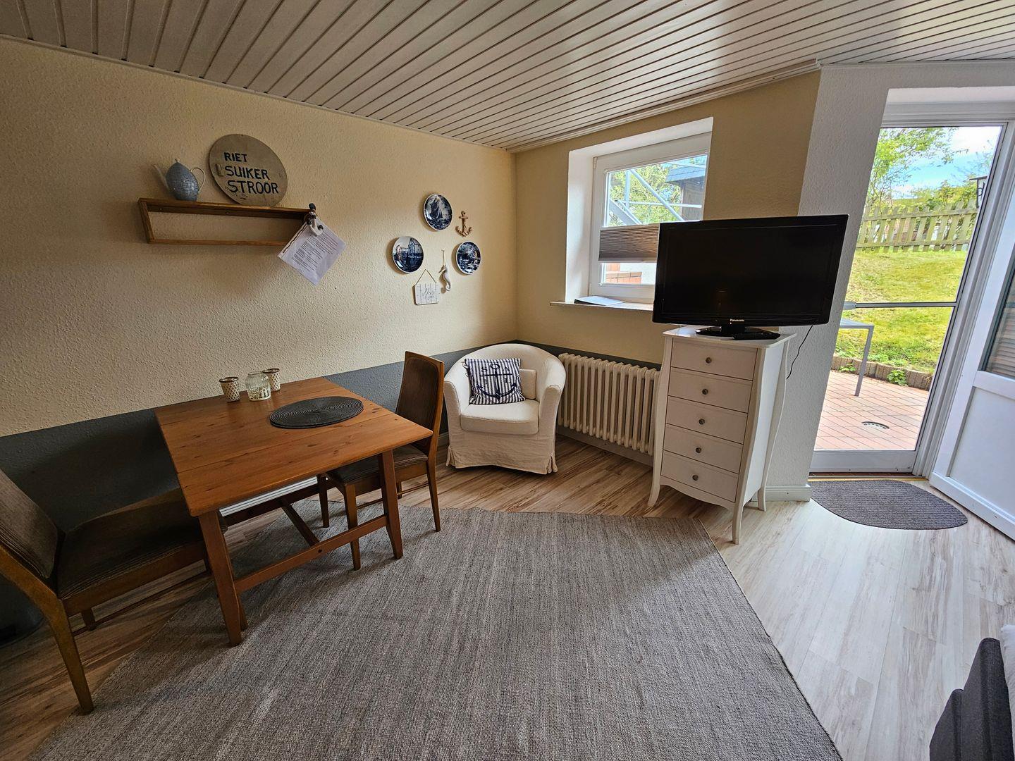 Der kombinierte Bereich lädt mit einem Fernseher, sowie den beiden Sesseln zum verweilen ein. Ein Esstisch mit 2 Plätzen grenzt direkt an die offene Küchenzeile, welche einen Zwei-Plattenherd, Mikrowelle, Kühlschrank, Kaffeemaschine, Wasserkocher und Toaster, sowie ausreichend Teller, Gläser und Besteck enthält.