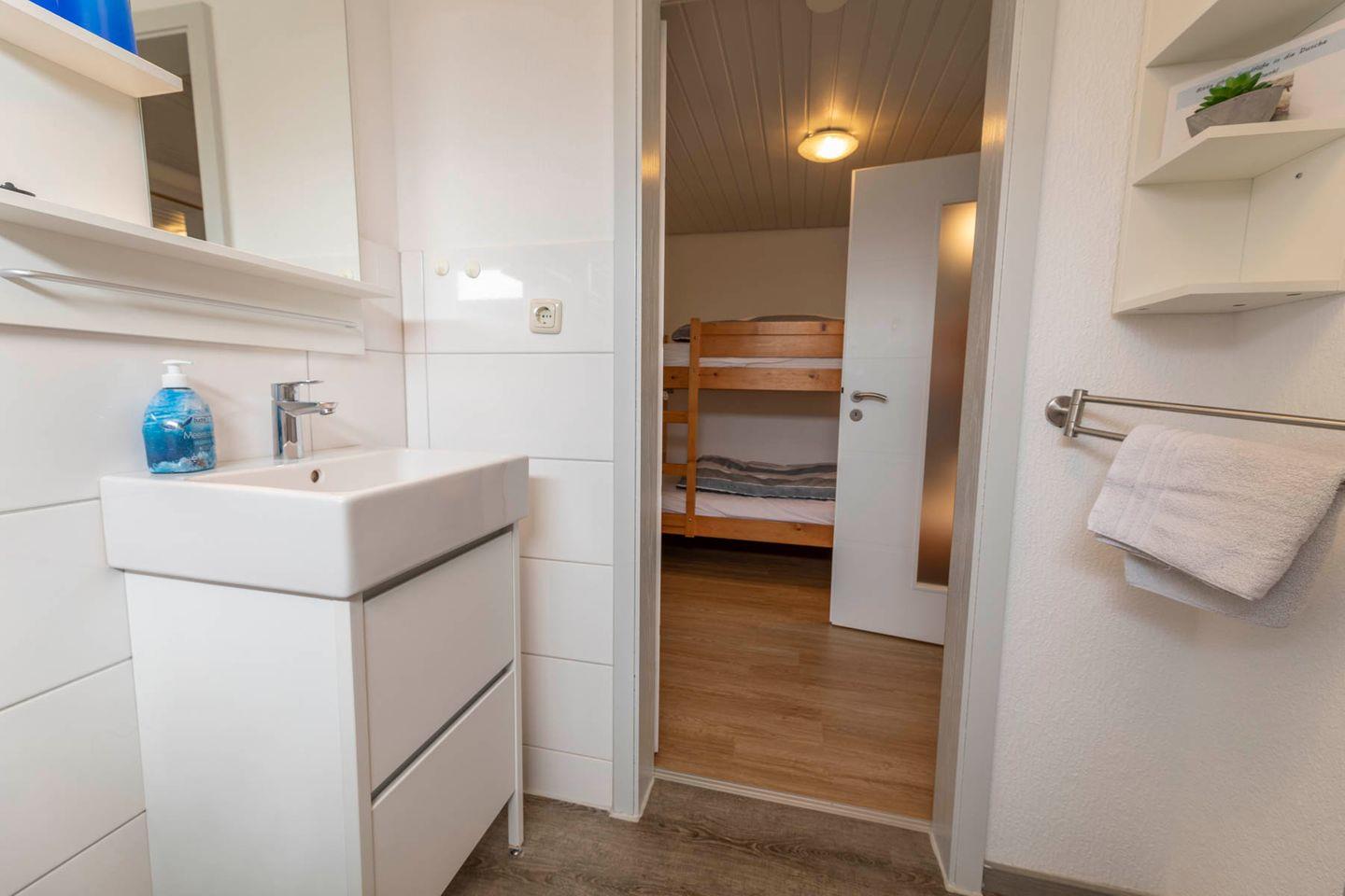 Ein komfortables Schlafzimmer mit einem 1,80 breitem Doppelbett und einem großen Schrank, ein kleines Schlafzimmer mit Etagenbett und ein Duschbad machen die Wohnung ideal für einen Familienurlaub mit Kindern.