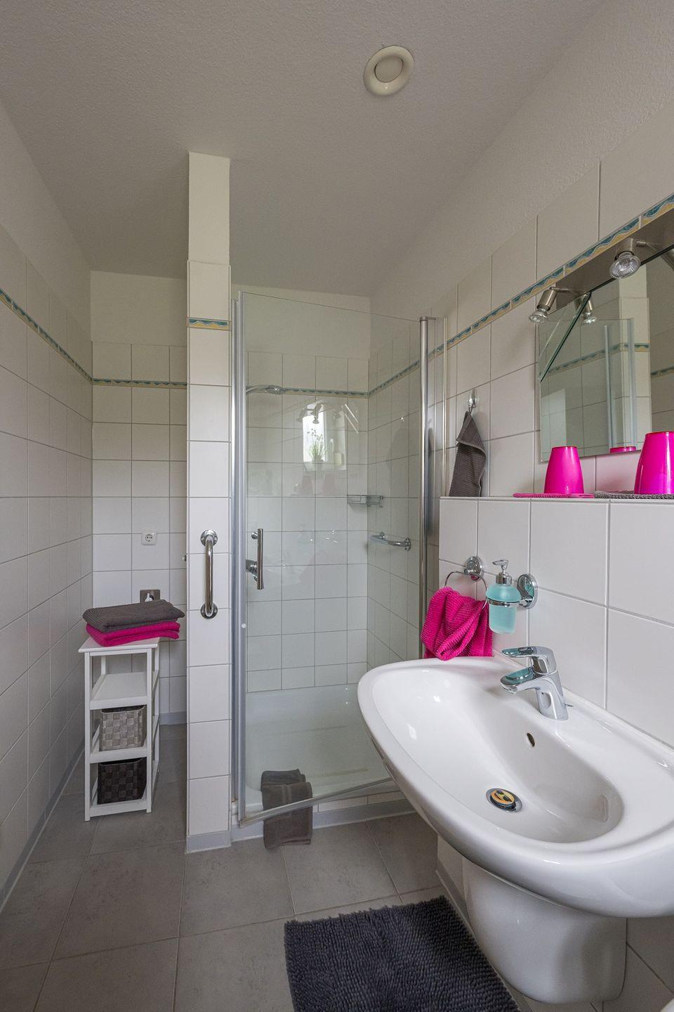 Das moderne Duschbad lässt ebenfalls keine Wünsche offen. Die Dusche lässt sich mit einer Glastür verschließen. Helle Fliesen sorgen für einen modernen Gesamteindruck. Deckenspots, ein Waschtisch mit großem Spiegel und ein Fön sind hier vorhanden.