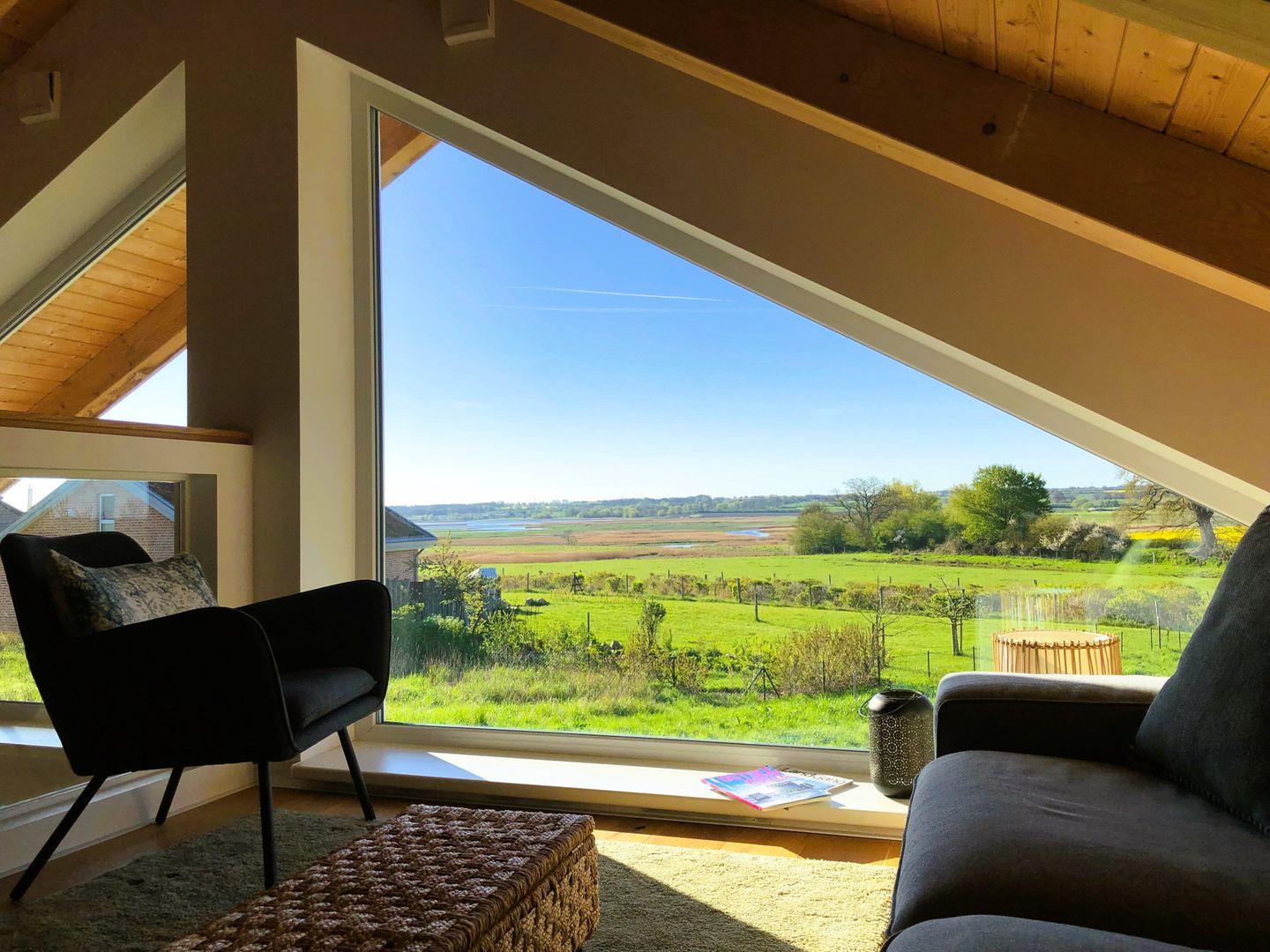 Das Haus mit eigenem Grundstück (rund 840 m²) liegt von der Straße abgewandt und direkt anschließend an das Naturschutzgebiet „Sehlendorfer Binnensee“. Von der Terrasse, durch die Panoramafenster im Wohnraum des EG oder von der Galerie bietet sich ein traumhafter Blick auf das Landschaftsschutzgebiet. Es lassen sich unzählige Vögel, wie Kraniche, Frischreiher und sogar Seeadler, weidende Galloway-Rinder und das immer wieder wechselnde Lichtspiel am weiten Himmel beobachten.