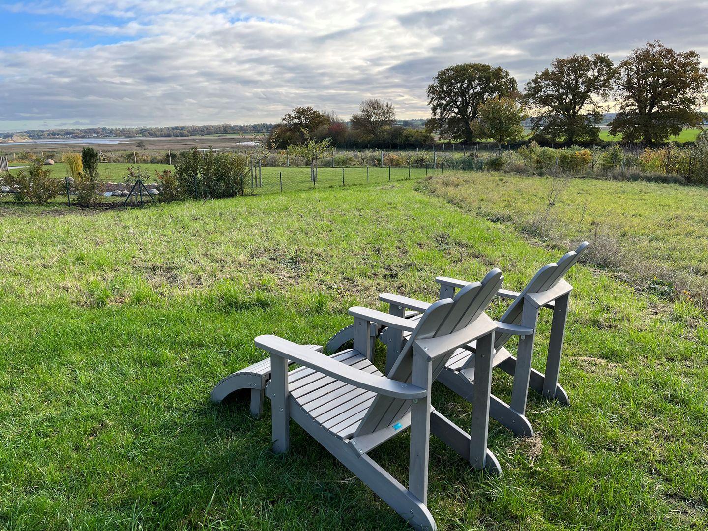 Die Terrasse mit Tisch, Stühlen, Liegestühlen und Sonnenschirm laden ein zum Verweilen und Essen im Grünen. Die Rasenfläche und umliegenden Wiesen bieten reichlich Platz für Spiel und Spaß. Eine Schaukel bietet viel Spaß für die Kinder, von dieser kann man hervorragend den tollen Ausblick in die Natur genießen. Auf dem Grundstück sind zwei sehr große PKW Stellplätze vorhanden.