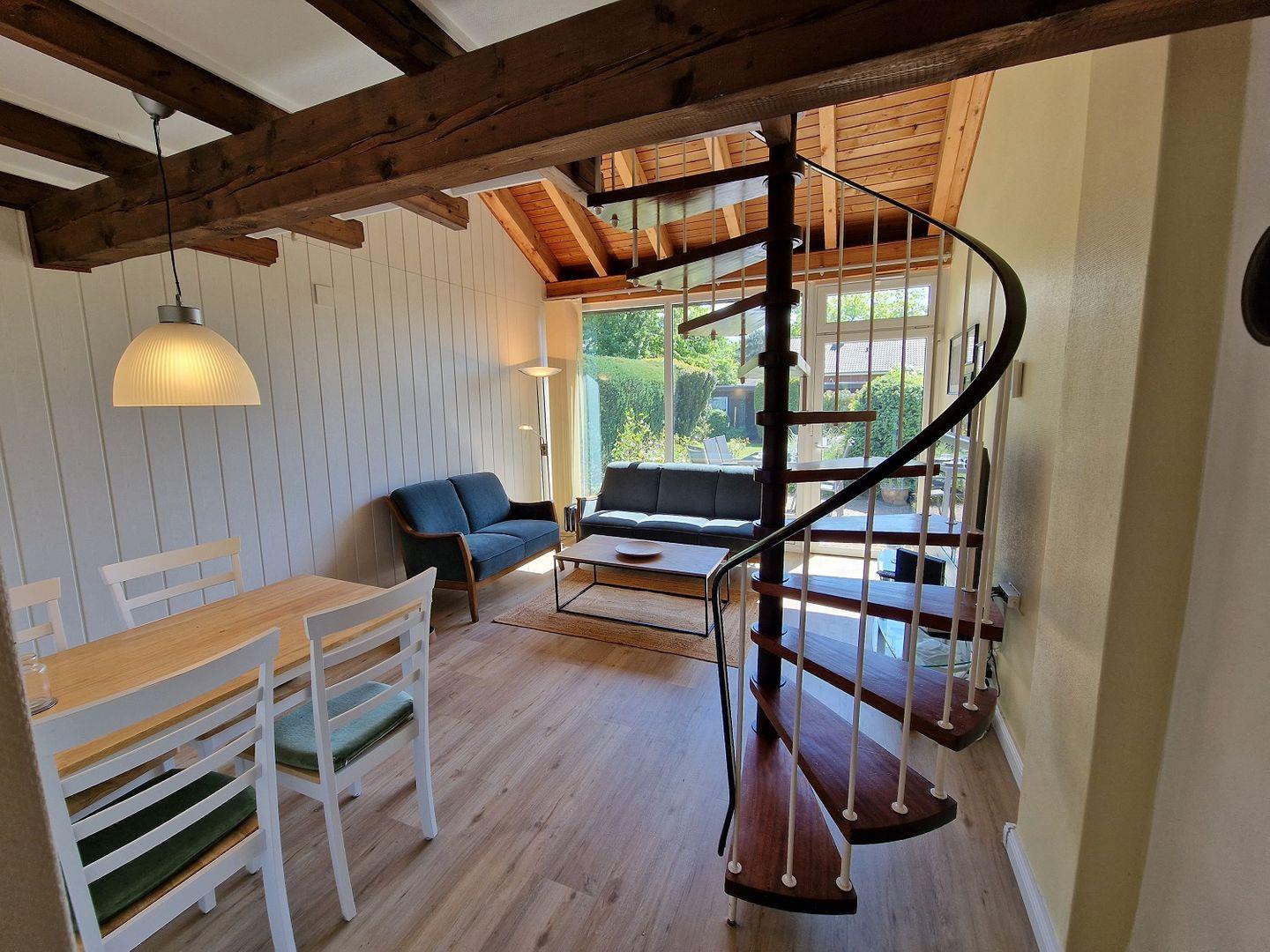 Die Wohnung verfügt über zwei Schlafzimmer, die für eine optimale Privatsphäre sorgen. Das erste Schlafzimmer ist über eine ansprechende Wendeltreppe vom Wohnbereich aus zugänglich. Hier erwartet Sie ein gemütliches Doppelbett, das für erholsame Nächte nach einem erlebnisreichen Tag sorgt. Im zweiten Schlafzimmer im Erdgeschoss befinden sich zwei Einzelbetten, perfekt für Kinder oder Freunde. Beide Schlafzimmer bieten reichlich Stauraum für Kleidung und persönliche Gegenstände.