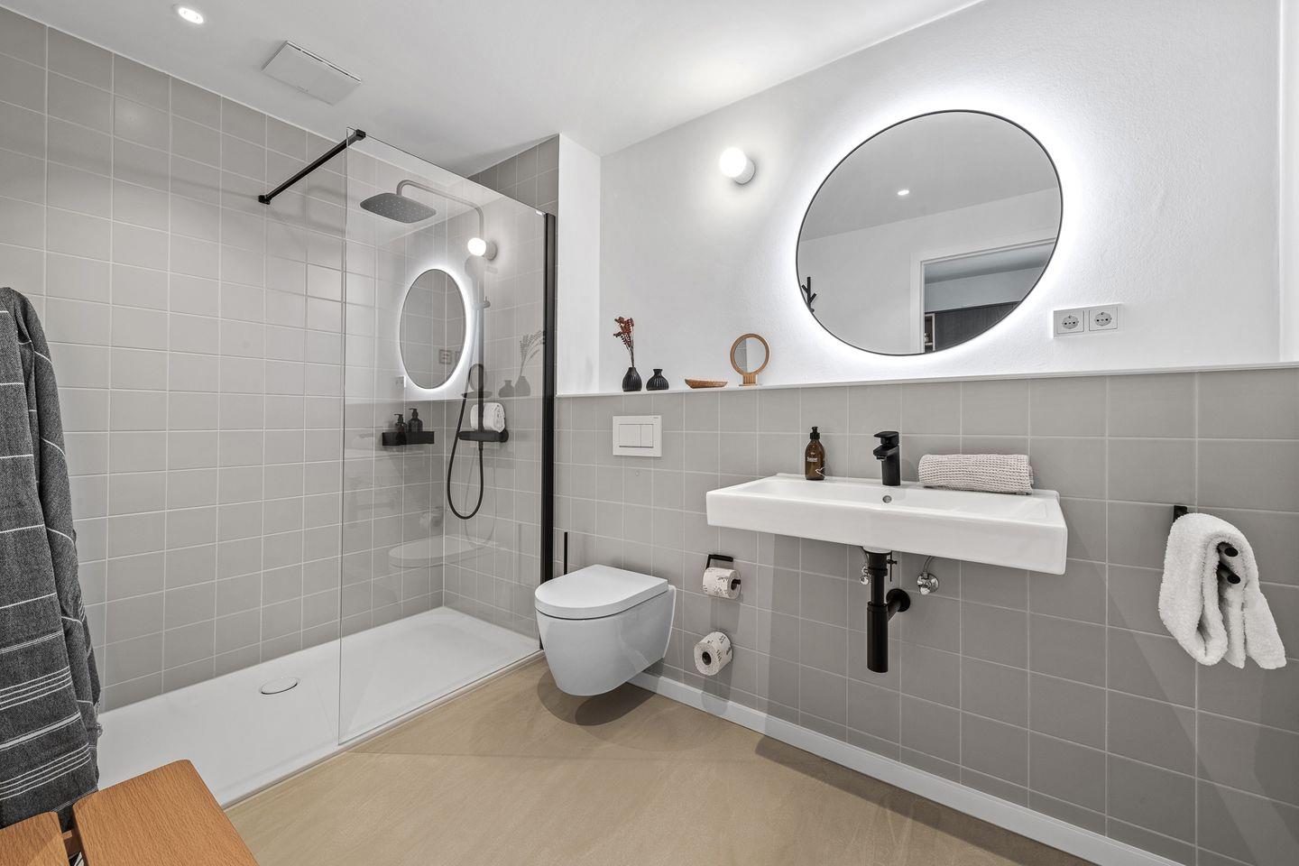 Die Ferienwohnung hat kostenloses schnelles WLAN, einen Smart-TV, eine komplette Küchenausstattung. Die Inneneinrichtung vereint natürliche Materialien, wunderschöne Farbtöne und zeitloses Design im modernen Cottage-Stil. Eine dunkle Küche mit Farbakzenten gibt der Wohnung den gewissen Charme. Ebenfalls ist das Apartment Smarthome-ready ausgestattet, inkl. der Heizung. Ein intelligentes Schließsystem vereinfacht den Zugang über einen individuellen Code und verbessert die Sicherheit. Jedes Apartment verfügt außerdem über zusätzlichen Stauraum im Keller (inkl. Fahrradkeller, Ladestationen für E-Bikes uvm.). Auch Waschmaschinen befinden sich im Keller und können kostenlos genutzt werden.
