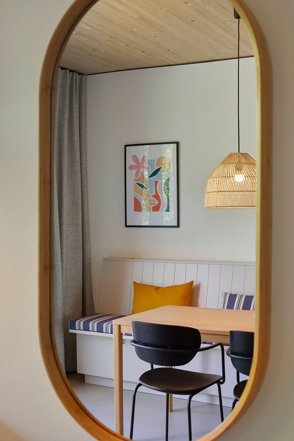 De ole School - nachhaltige Ferienwohnung mit Hygge-Feeling an der Ostsee. Zwei Geschosse mit Dachterrasse sorgen in dieser stilvollen Maisonette-Ferienwohnung für viel Freiraum. Ein separater Wohnbereich, der auch als Schlafzimmer genutzt werden kann, und ein extra Gäste-WC machen diesen Wohnungstyp besonders vielseitig und komfortabel. In der oberen Etage befinden sich ein Schlafzimmer mit einem Doppelbett, die Dachterrasse und ein schickes Badezimmer mit Dusche und WC. Der Wohn- und Essbereich, der durch eine Schiebetür abgetrennt ist, die offene Küche, das Gäste-WC und eine Abstellkammer mit Waschmaschine befinden sich in der unteren Etage. Die Ferienwohnung hat kostenloses schnelles WLAN, einen Smart-TV, eine komplette Küchenausstattung und eine Dachterrasse mit Weitblick aufs Quartier und die Felder. Ein intelligentes Schließsystem mit PIN-Code macht den Check-In flexibel. Jedes Apartment verfügt außerdem über zusätzlichen Stauraum im Keller (inkl. Fahrradkeller).